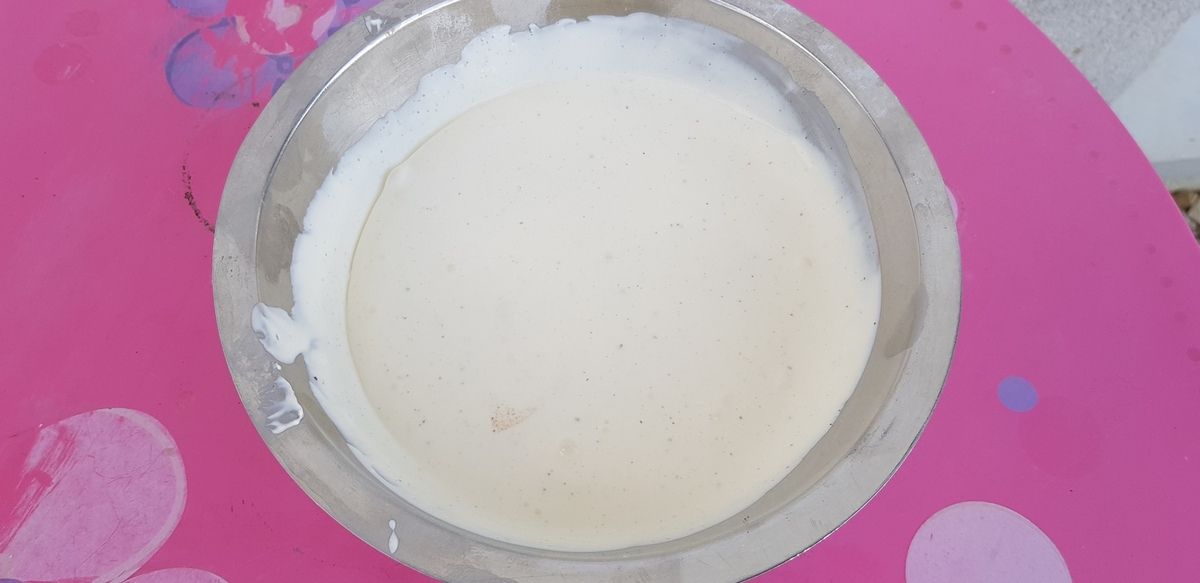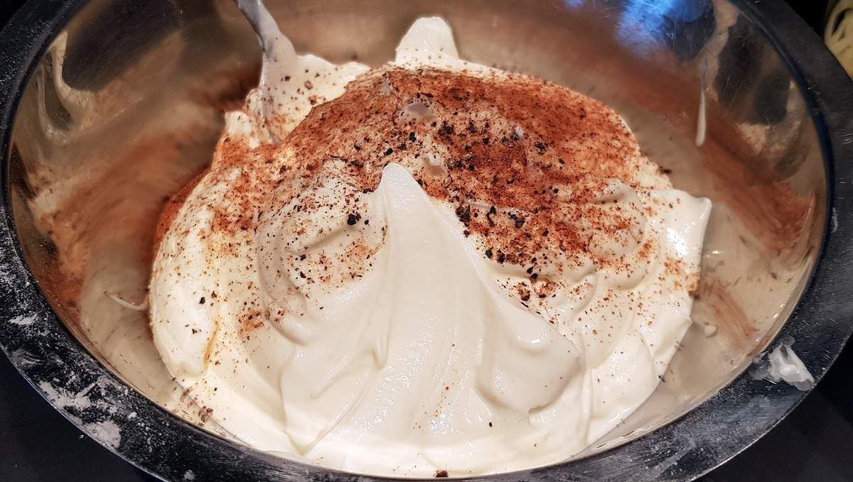 4) Dans un récipient, mettre la crème et l'assaisonner avec sel, poivre et muscade. Ne pas trop saler, les lardons l'étant déjà. Bien mélanger.