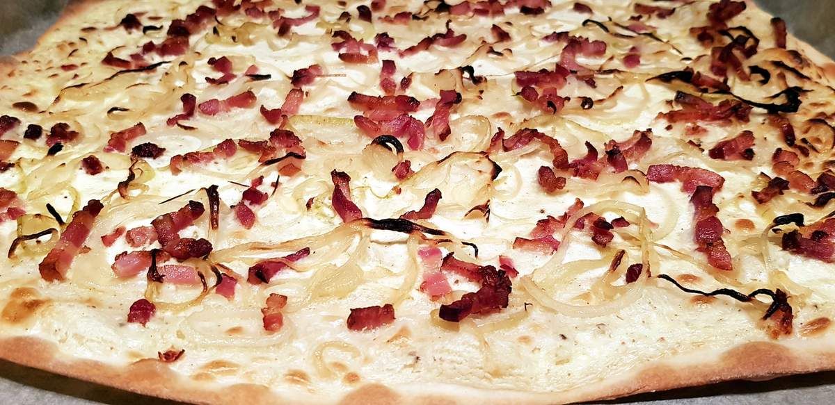 Faite maison comme je vous le propose, cette tarte flambée est délicieuse. La pâte est fine et croquante et la garniture aux oignons, lardons et crème lui donne toute sa gourmandise.
