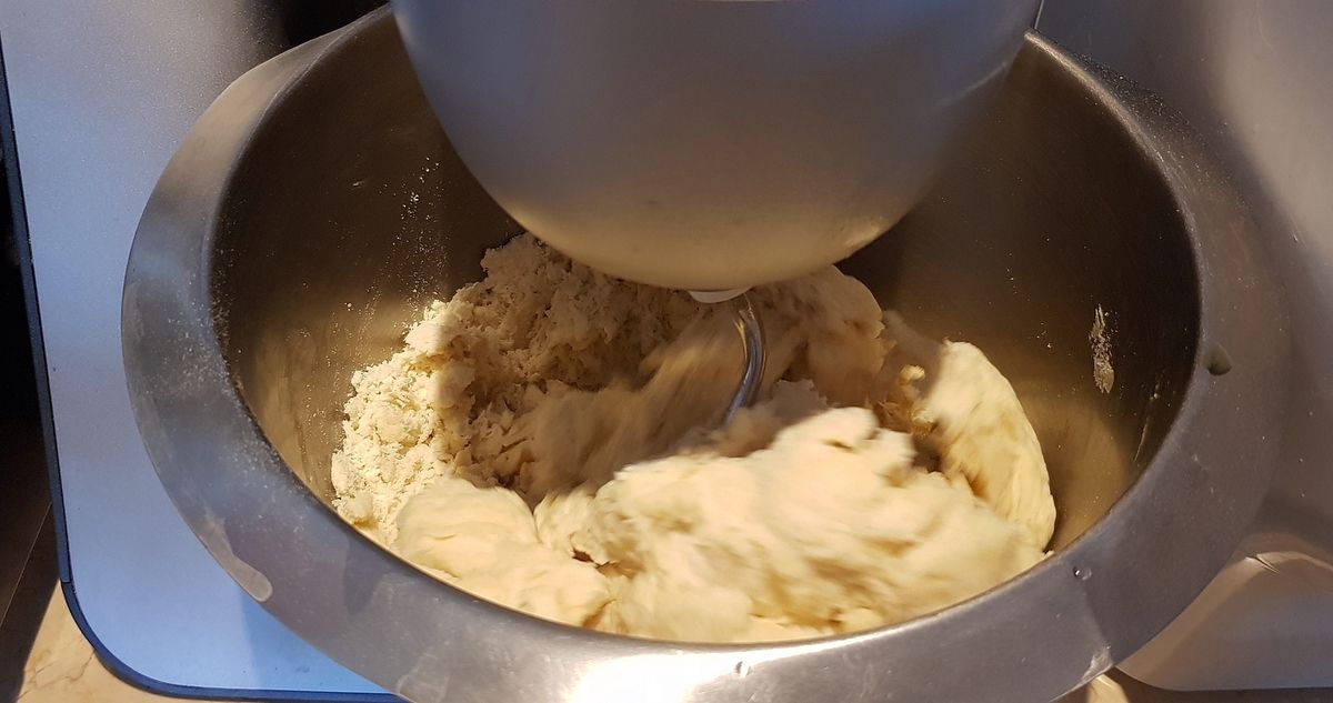 1) Préparer la pâte: dans le bol d'un robot, mettre la farine et le sel. Actionner le robot avec le crochet. Ajouter l'eau doucement et l'huile. Laisser le crochet pétrir la pâte quelques minutes. Elle doit être bien homogène et lisse. Il est également possible de préparer et pétrir la pâte à la main. La pâte doit se détacher facilement du crochet. Former une boule.