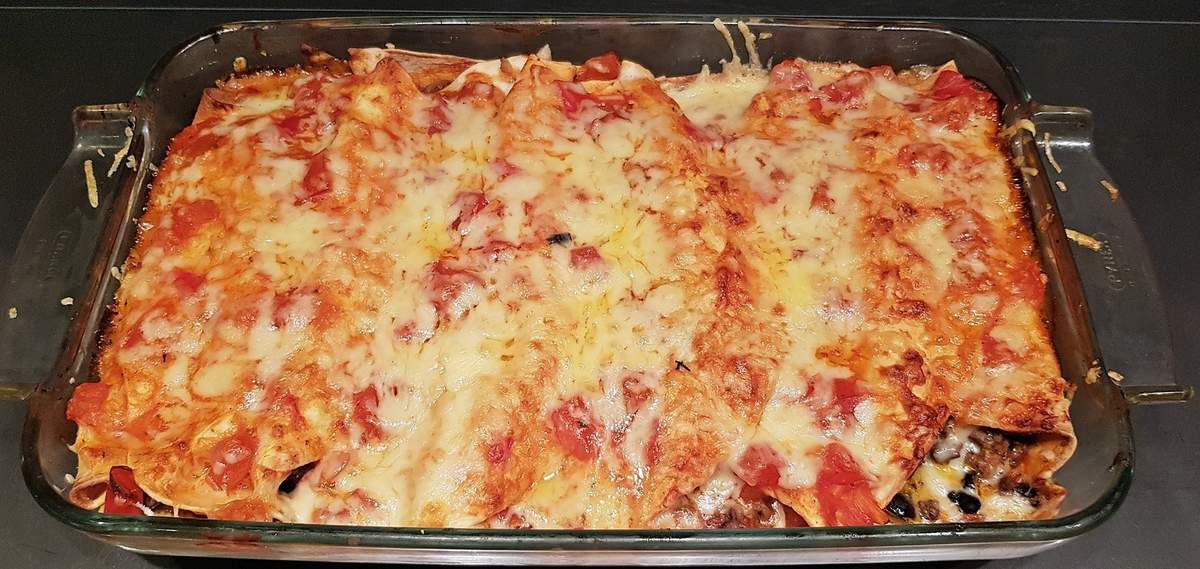 En deux mots, une farce à la viande de boeuf et aux haricots noirs à tomber, une sauce rouge à base de piment, de tomates, d'ail et d'origan et du Cheddar pour couronner le tout. Résultat: des Enchiladas parfaitement assaisonnées, onctueuses, gourmandes... addictives!
