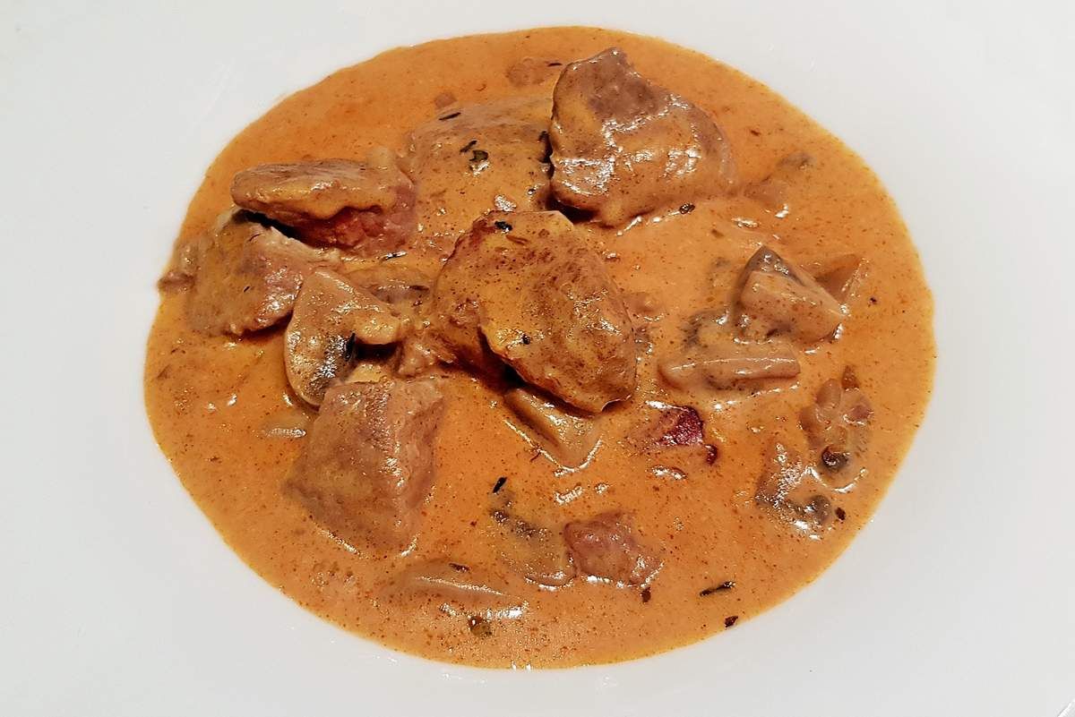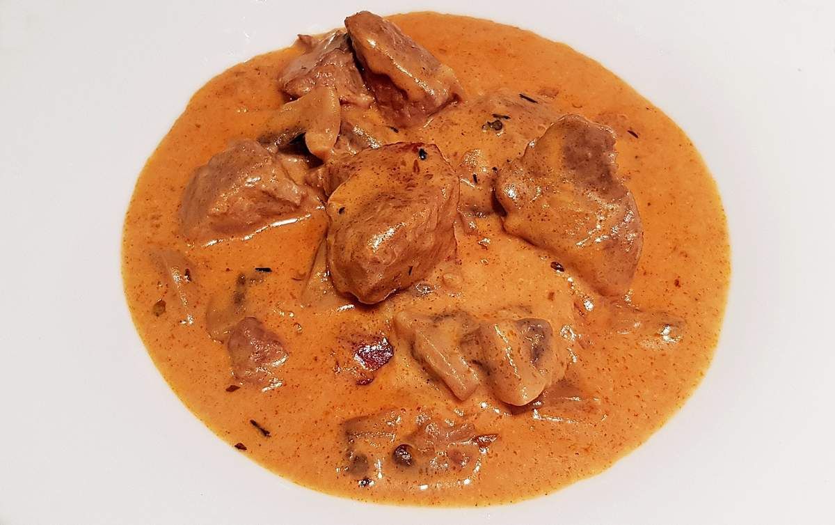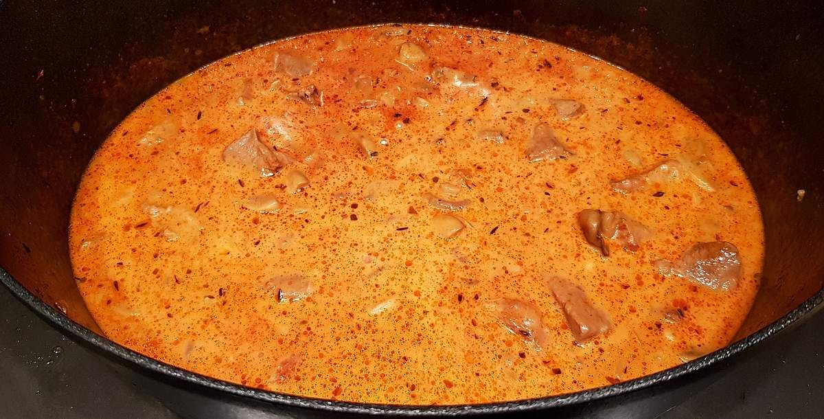 6) Porter à ébullition puis baisser sur feu doux et couvrir. Laisser cuire à couvert une heure. Puis enlever le couvercle et laisser cuire encore une heure pour que la sauce réduise. Lorsque la viande est bien tendre, ajouter la crème dans laquelle vous aurez dilué la fécule avec une fourchette. Laisser cuire encore 5 minutes puis goûter et rectifier l'assaisonnement (sel, poivre, paprika...). Si la sauce est encore trop liquide, diluer à nouveau un peu de fécule dans un peu de crème et ajouter. Servir...