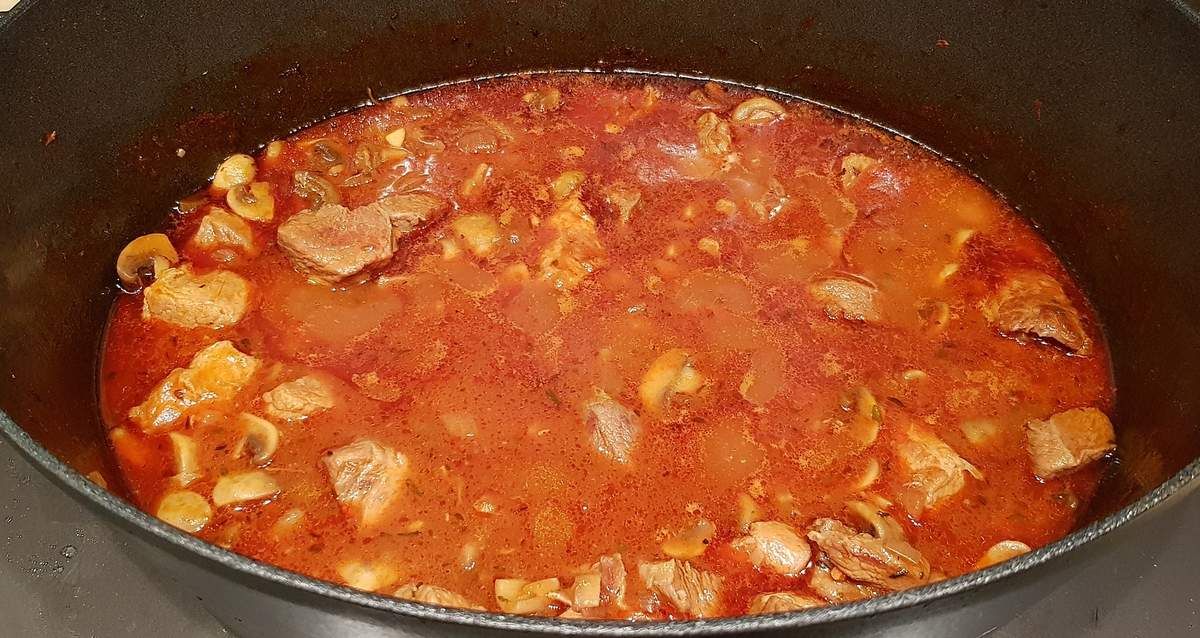 4) Remettre la viande, mélanger. Saupoudrer de paprika fort et doux. Ou uniquement du paprika fort, mais attention ;-) J'ai mis environ 1 belle càc de paprika doux et une demi càc de paprika fort. Mieux vaut en ajouter par la suite après avoir goûté! Ajouter aussi le concentré de tomates et bien mélanger.
