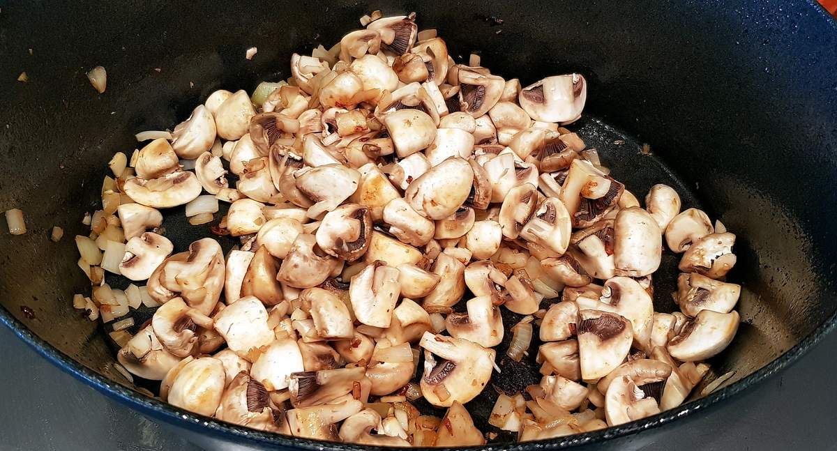 3) Dans le faitout, remettre un peu d'huile à rôtir à chauffer. Ajouter ail et oignon hachés ainsi que les champignons et faire revenir une minute. Ajouter la farine et bien bien mélanger.