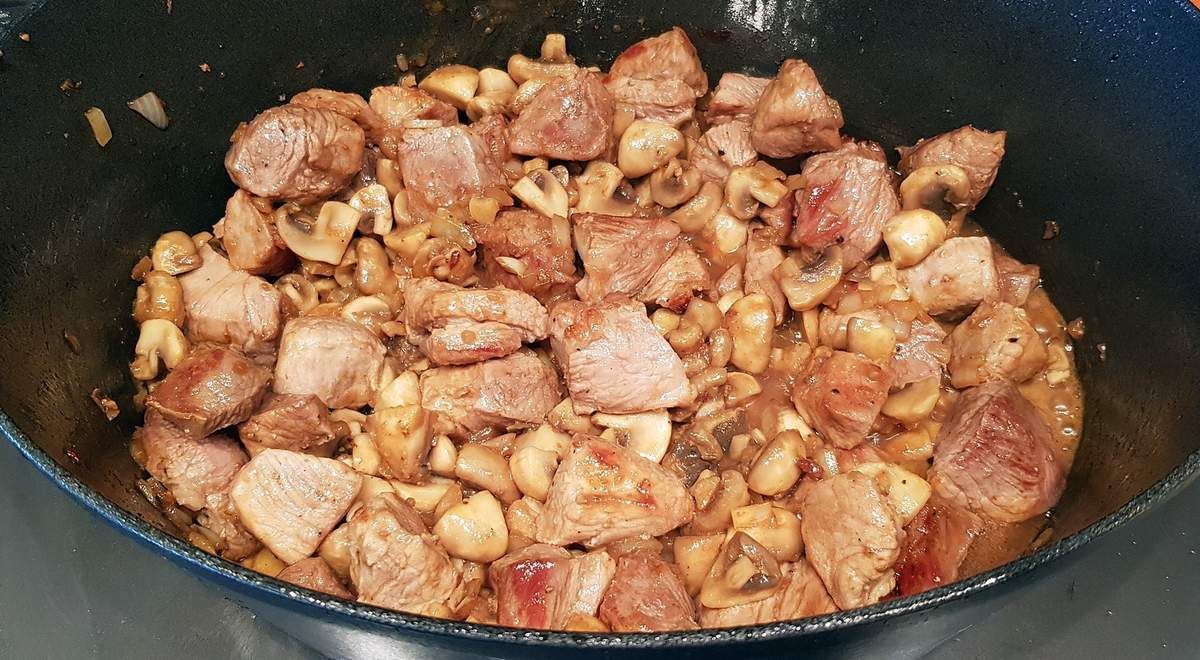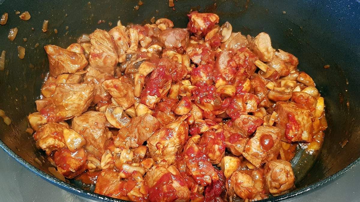 1) Dégraisser si nécessaire la viande de porc avec un couteau. Couper si ce n'est pas déjà fait des morceaux de la taille d'un gros dé et mettre dans un plat. Peler et hacher oignon et ail. Essuyer les champignons de Paris avec du papier ménage pour les nettoyer, couper l'extrémité des pieds puis couper chaque champignon en quatre ou en six pour les plus gros. Les morceaux ne doivent pas être trop fins.