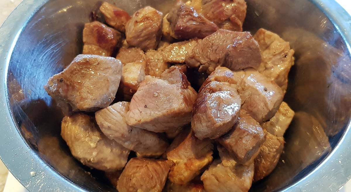 2) Dans un faitout, mettre à chauffer un filet d'huile ou de beurre à rôtir. Sur feu vif, faire revenir la viande. Eviter que les morceaux ne se superposent et laisser colorer sans mélanger quelques minutes, le temps que les morceaux forment une petite croûte. Puis mélanger et faire revenir encore quelques minutes jusqu'à ce que la viande soit dorée de toutes parts. Saler et poivrer. Réserver dans un récipient. Déglacer les sucs avec un peu d'eau en frottant le fond avec la spatule et mettre ce jus avec la viande.