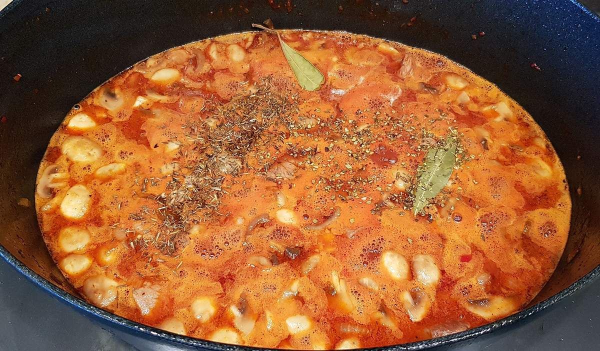 5) Ajouter le cube de bouillon de boeuf, le vin blanc, le laurier et quelques pincées de thym et d'origan séchés.
