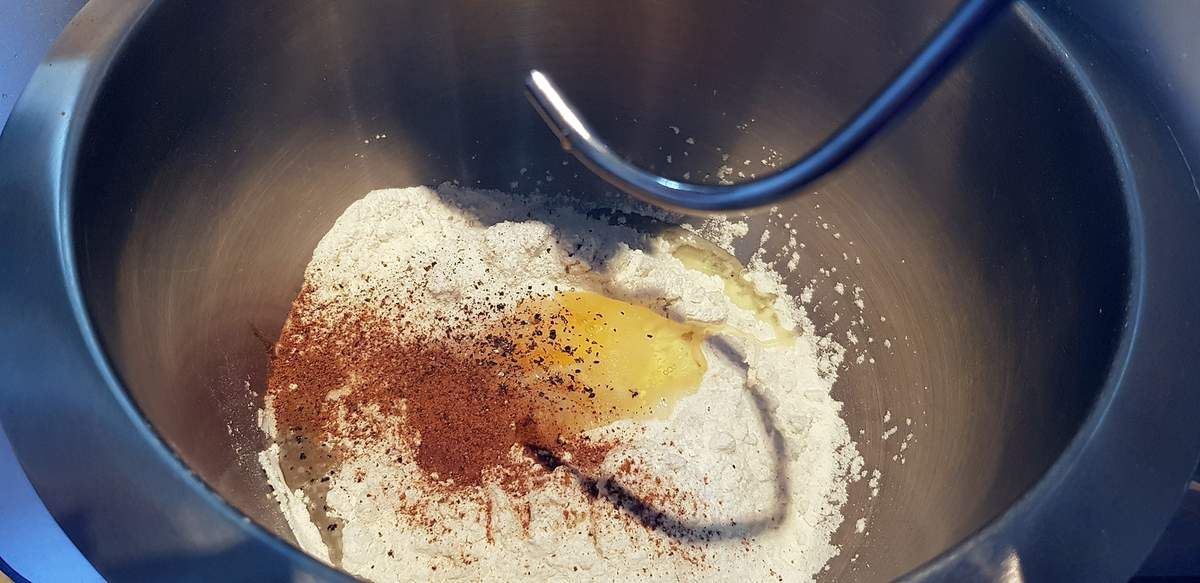 2) Dans le bol d'un robot ménager, mettre la farine, les oeufs, 2 cuillères à café de sel, un peu de poivre et de muscade. Mélanger grâce au crochet à moyenne vitesse ou mélanger soigneusement avec une spatule. Ajouter les pommes de terre écrasées et bien mélanger pour obtenir un mélange homogène.