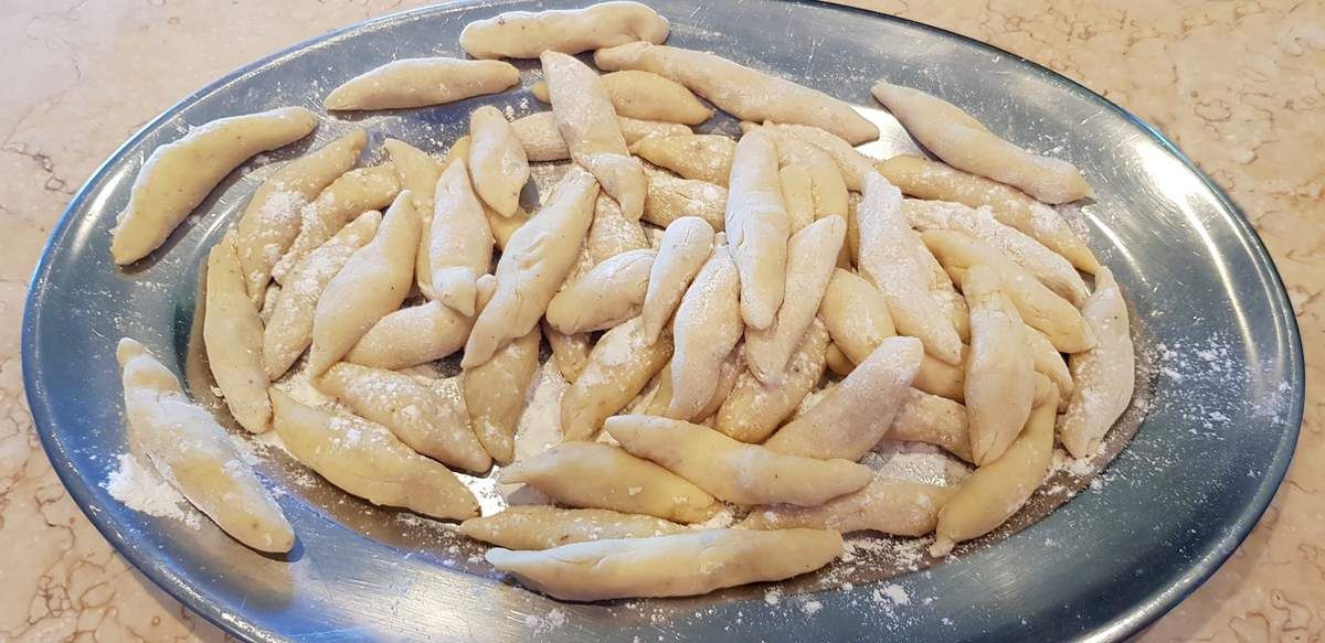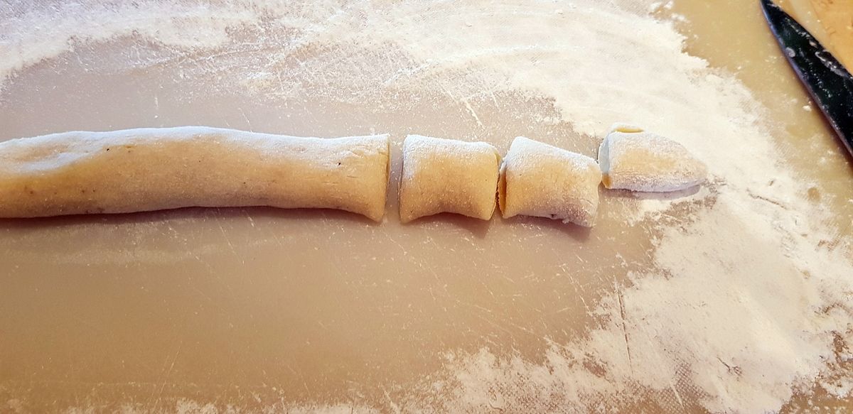 3) Fariner le plan de travail ou une grande planche. Prendre un peu de pâte et façonner un long boudin. Couper des tronçons de 3 à 4 cm. Façonner chaque tronçon en forme de Schupfnudeln, en le roulant sur le plan de travail (d'une longueur de 5 cm environ). Le centre est arrondi et les extrémités fines, étirées un peu en pointes. Fariner légèrement chaque pièce et réserver sur un plat. Répéter l'opération jusqu'à épuisement de la pâte.