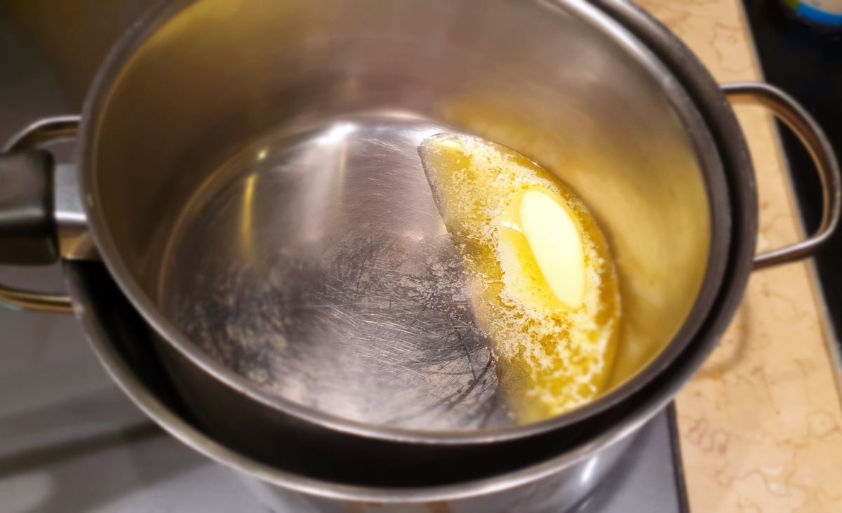 3) Mettre de l'eau dans une casserole sur le fond et placer une casserole plus petite à l'intérieur, de façon à ce qu'elle touche juste l'eau. Mettre le beurre dans la casserole et le faire fondre sur feu moyen-doux.