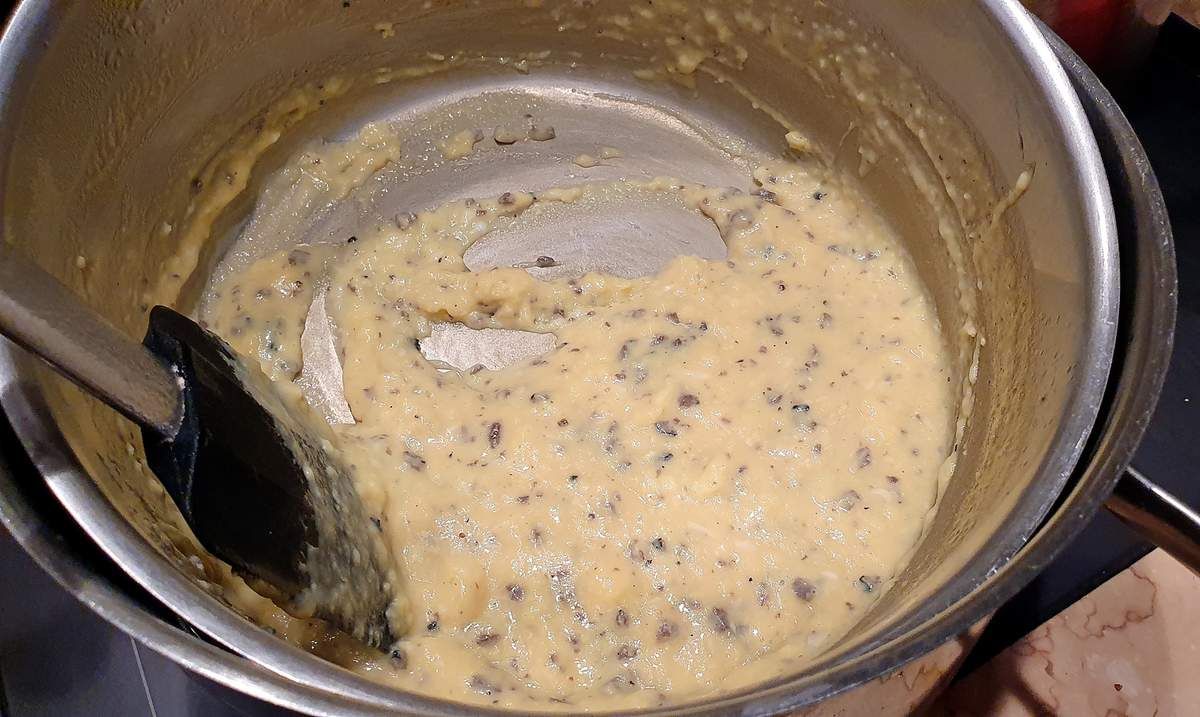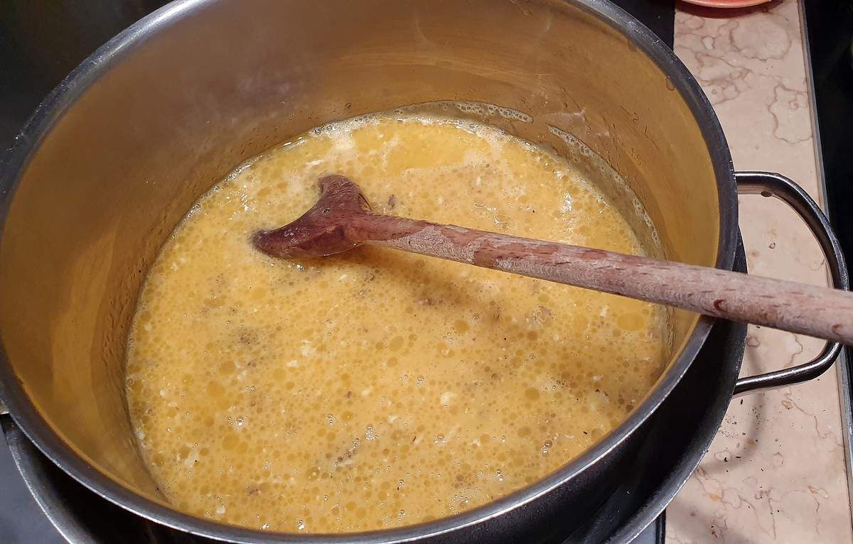 4) Lorsque le beurre est fondu, mettre le mélange aux oeufs dans la casserole et sur feu doux, tourner sans arrêt avec une spatule en bois en détachant régulièrement les bords. Le mélange doit cuire très doucement et il ne faut pas hésiter à retirer régulièrement la casserole puis la remettre. Lorsque la brouillade est onctueuse, verser le décilitre de crème et mélanger. Remettre sur le feu un tout petit moment, toujours en mélangeant, jusqu'à l'obtention d'une consistance crémeuse mais prise (comme sur la photo ci-dessous).