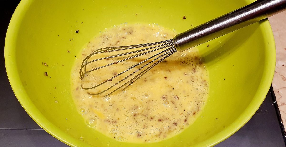 2) Le jour-même, une à deux heures avant la cuisson, casser les oeufs dans un saladier et les fouetter très légèrement, juste pour casser les jaunes avec les blancs. Hacher finement les 25 grammes de truffe et les ajouter dans le saladier. Saler, poivrer et mélanger.