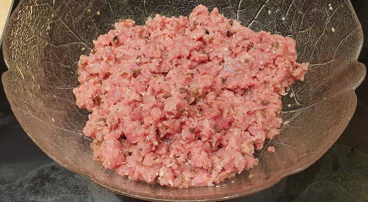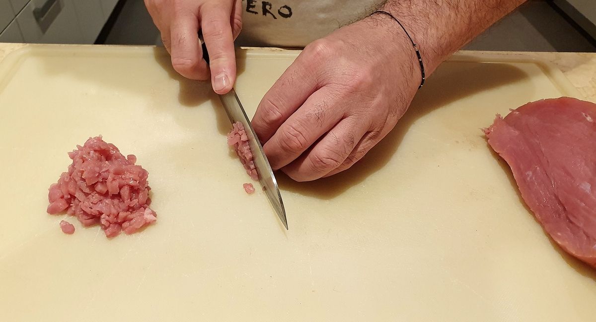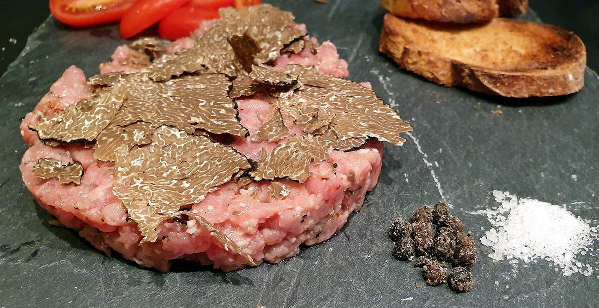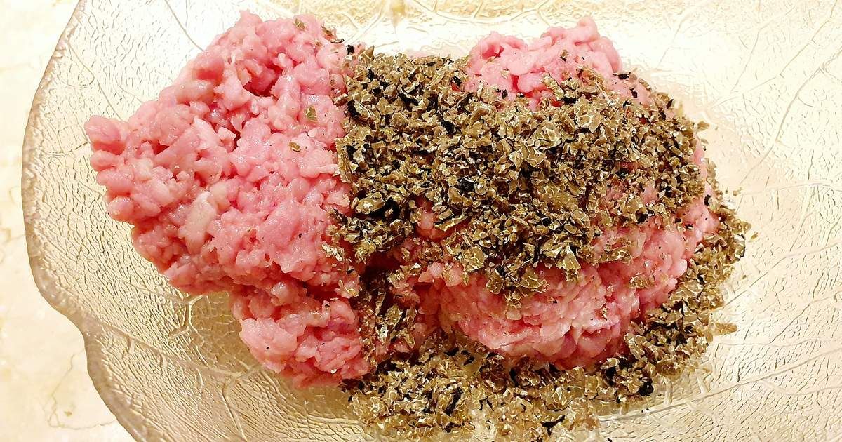 1) Couper la viande en tout petits morceaux et mettre dans un plat. Hacher 20 grammes de truffe (garder 10 grammes pour le service) et ajouter à la viande.