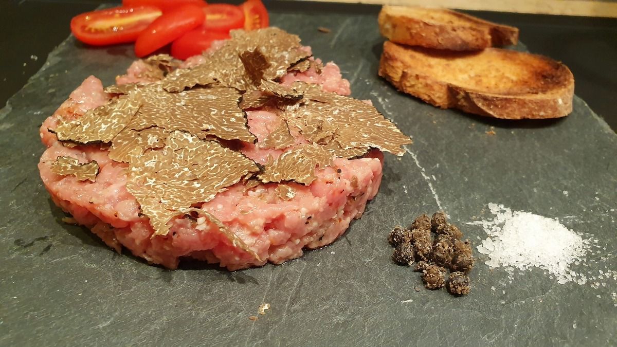 3) Sortir le tartare du réfrigérateur 15 minutes avant de servir. Ajouter encore 2 càs d'huile d'olive et mélanger. Goûter et rectifier l'assaisonnement (sel, poivre, piment...). Servir à l'aide d'emporte-pièce par exemple. Râper des copeaux avec la truffe restante sur le tartare. Déguster avec du pain toasté et un peu de beurre.