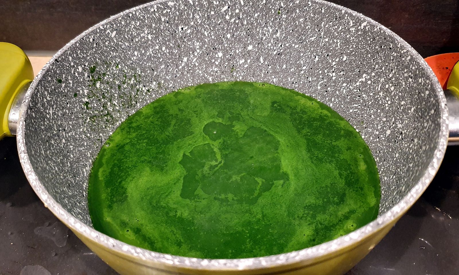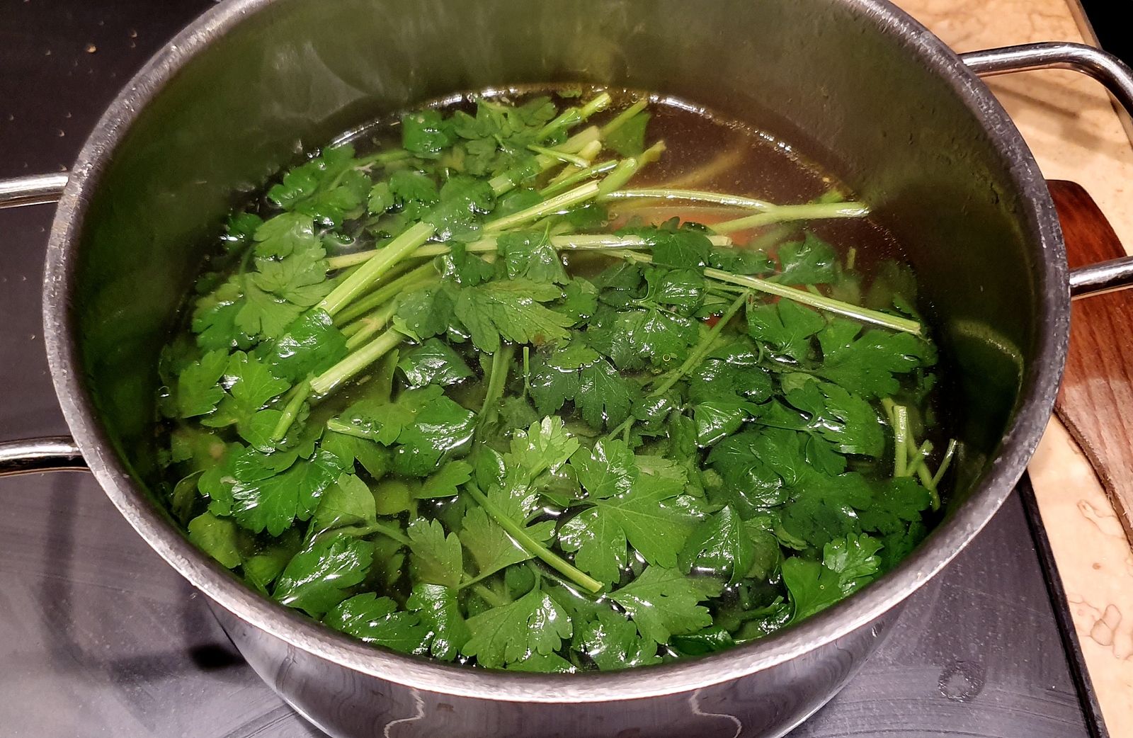 1) Préparer tout d'abord le jus de persil: passer le bouquet de persil sous l'eau froide et le couper très grossièrement, avec les queues. Plonger le persil dans une casserole d'eau (1, 5 litre) avec les deux cubes de bouillon puis porter à ébullition. Après 4 minutes de cuisson, égoutter le persil tout en conservant le bouillon car il sera utilisé plus tard. Rincer soigneusement le persil sous l'eau froide pour lui permettre de conserver une belle couleur. Essorer le persil entre les doigts et le mettre dans un récipient haut. Ajouter progressivement en mixant avec un plongeur environ 2 louches du bouillon. Le but est d'obtenir un jus finement mixé. Ensuite, passer ce jus au chinois pour qu'il ne reste que le liquide. Réserver dans une petite casserole.