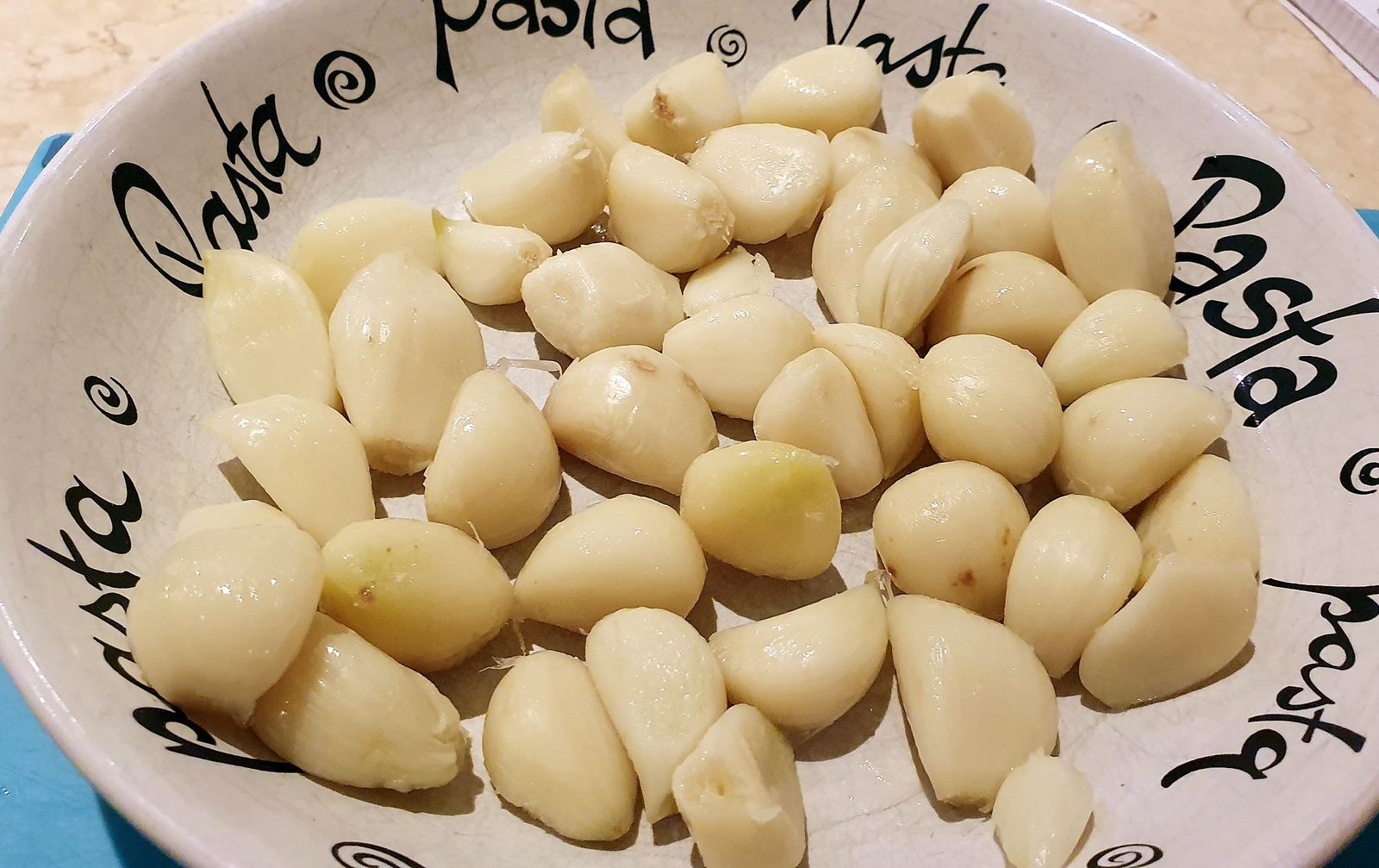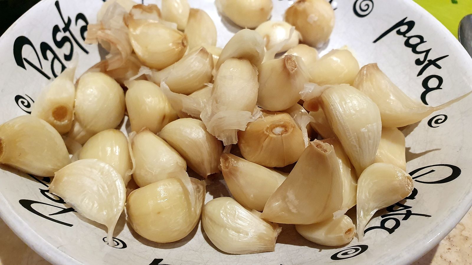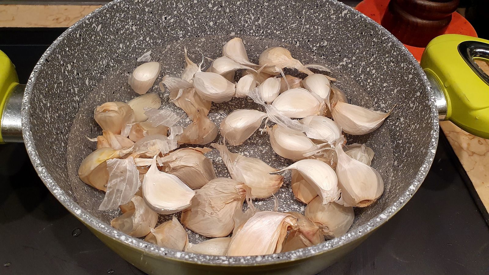 2) Préparer ensuite la crème d'ail: remplir d'eau froide une casserole. Casser les têtes d'ail pour en séparer les gousses. Plonger les gousses d'ail en chemise (avec la peau donc) dans la casserole. Porter à ébullition. A l'ébullition, compter encore une minute de cuisson. Egoutter les gousses et remettre de l'eau froide dans une casserole. Y plonger les gousses et répéter trois fois cette opération de cuisson. En tout, il faut le faire donc 4 fois.