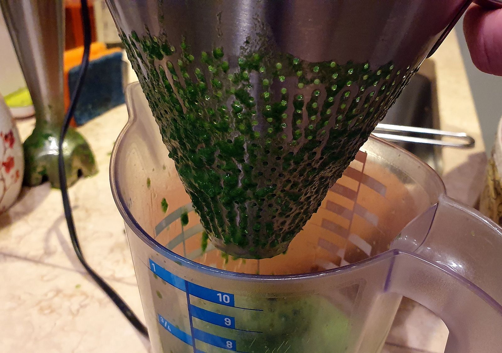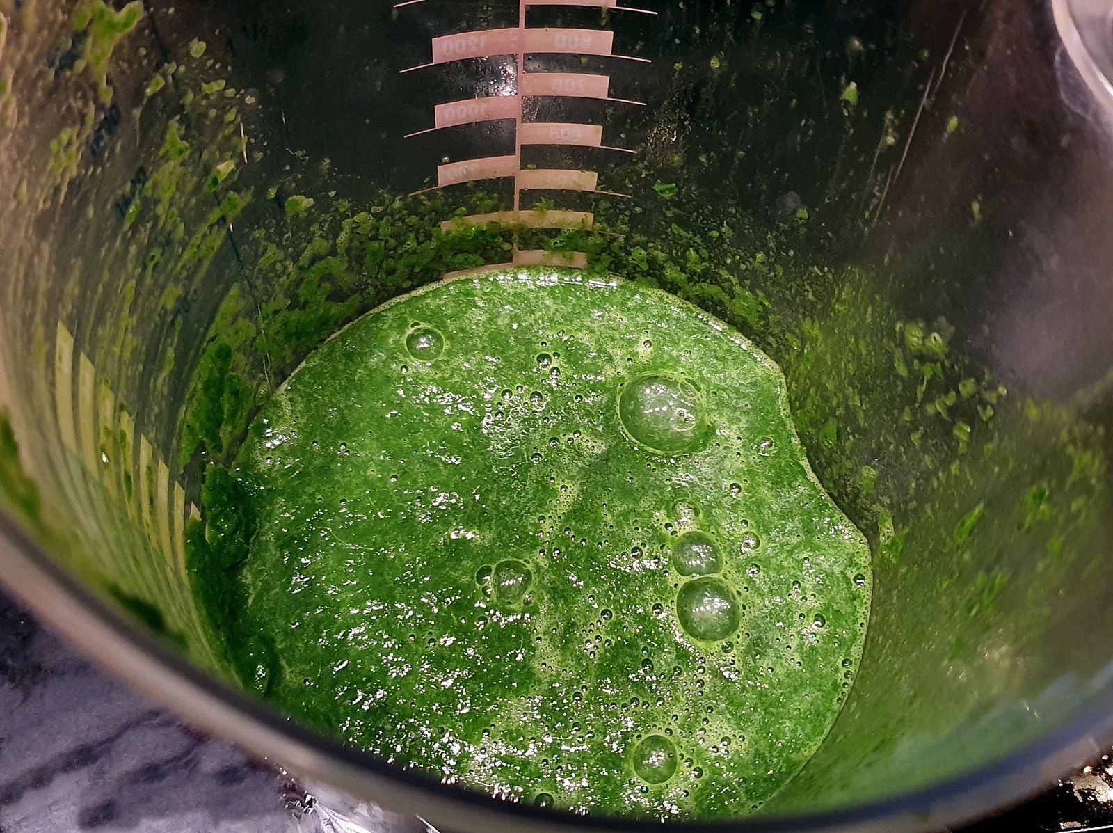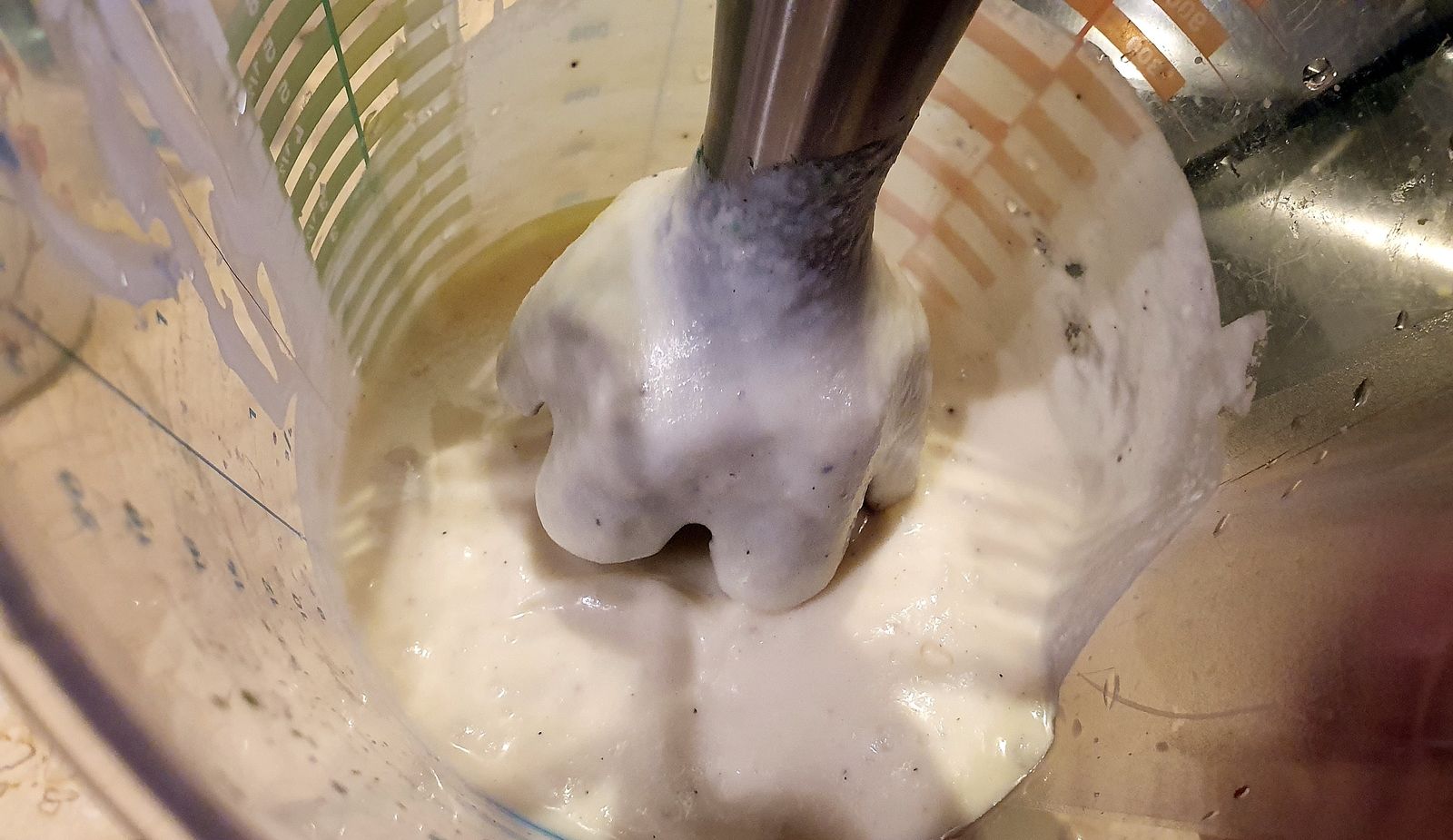 3) Eplucher les gousses d'ail et les mettre dans un récipient haut. Ajouter une louche de bouillon de base du persil (point 1) et mixer avec le plongeur jusqu'à consistance d'une purée. Saler et poivrer. Ajouter la crème et mixer encore un peu. Réserver dans une petite casserole.