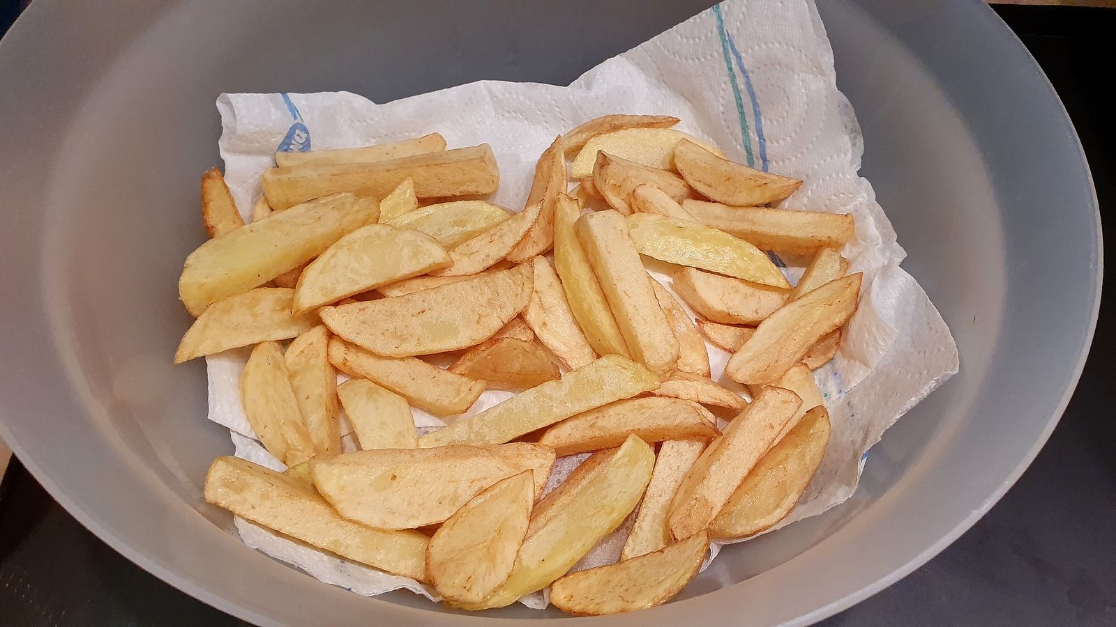 Il ne faut en effet pas laisser les frites longtemps sur le papier ménage, pour que l'huile reste quand-même bien sur les frites. C'est un passage express ;-)