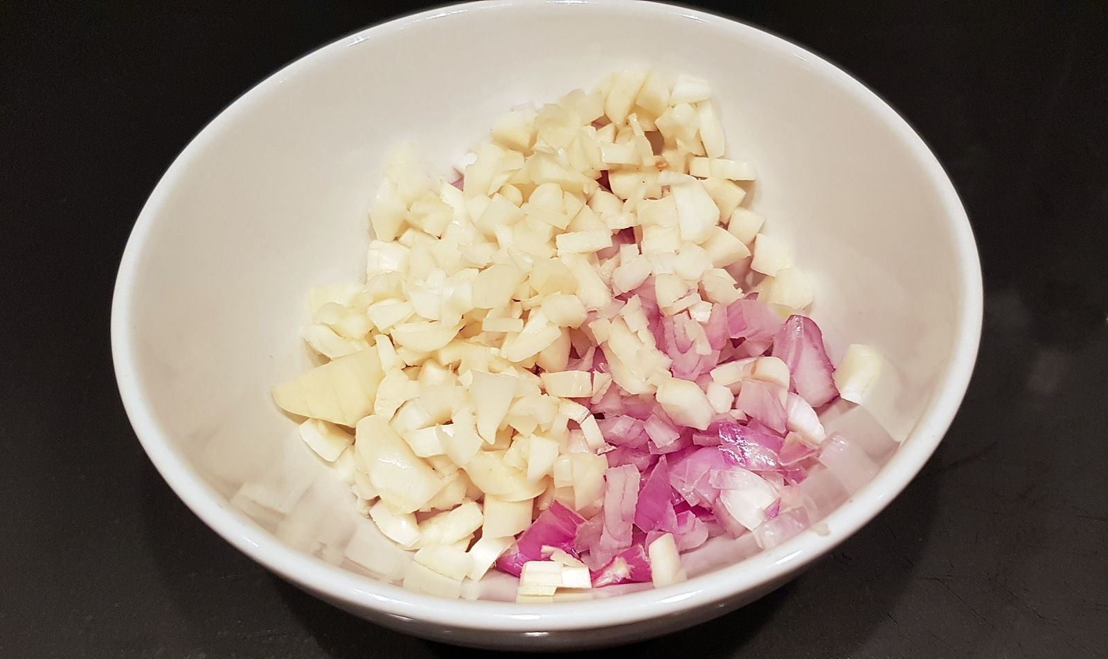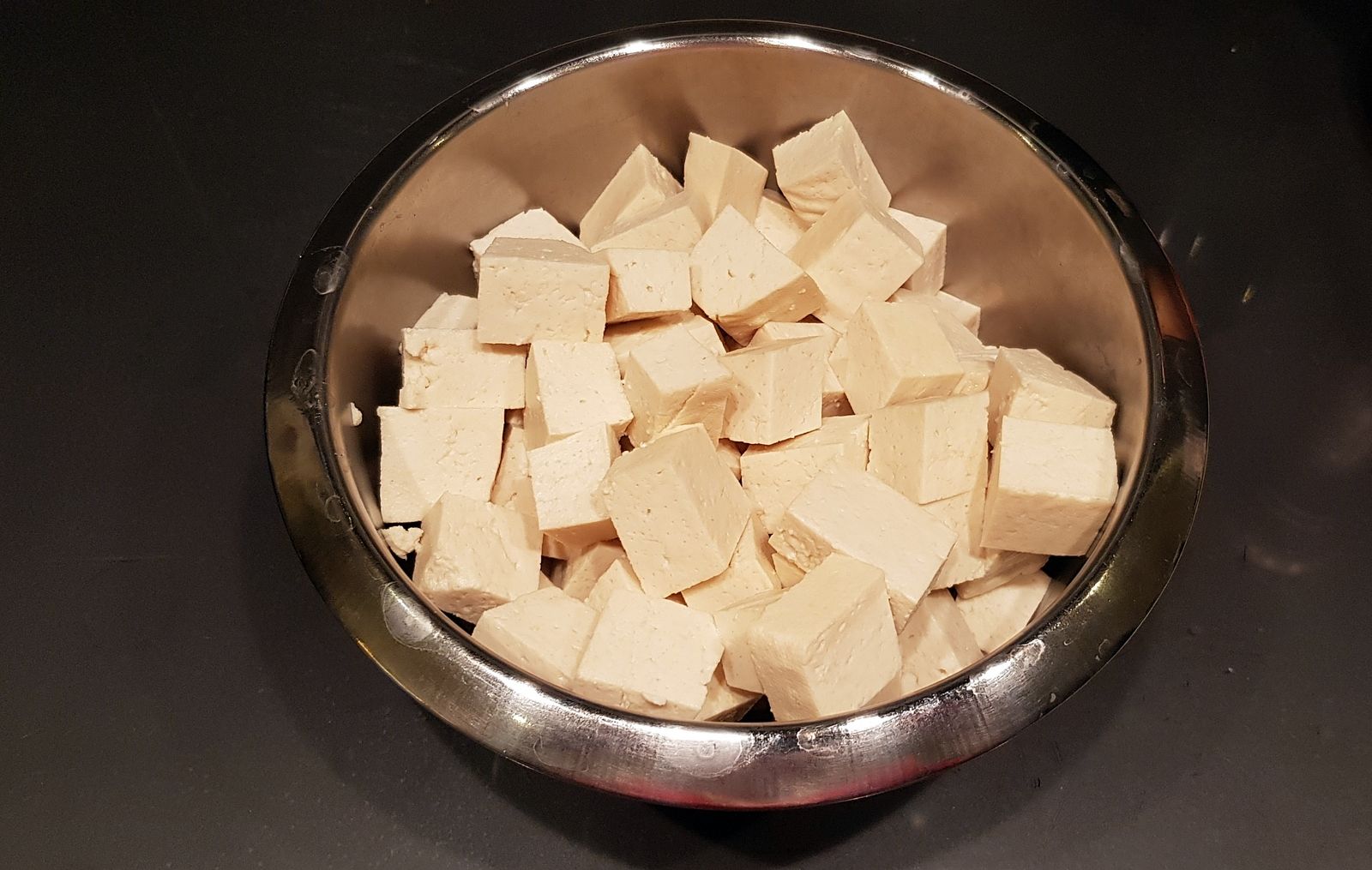 2) Peler et hacher finement ail et échalote. Réserver. Couper le tofu en cubes.