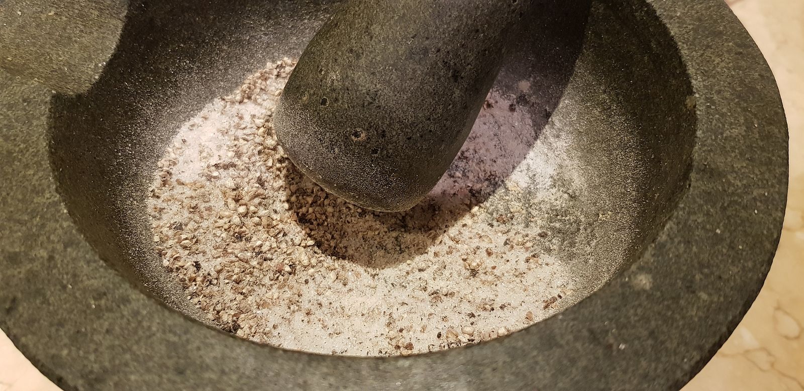 1) Dans un mortier, piler le sucre, les grains de poivre noir et le grains de poivre blanc finement.