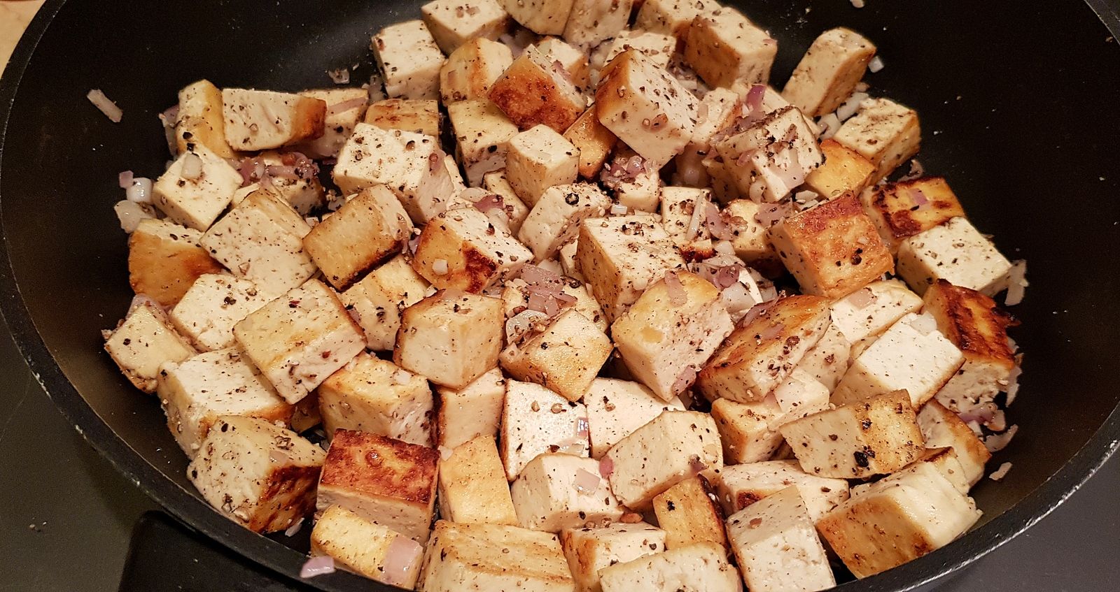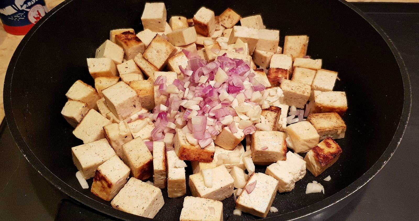 3) Mettre un filet d'huile dans une poêle à chauffer et faire revenir les dés de tofu quelques minutes en mélangeant jusqu'à ce qu'ils soient légèrement dorés. Ajouter l'échalote et l'ail et faire revenir encore 1 minute en mélangeant.