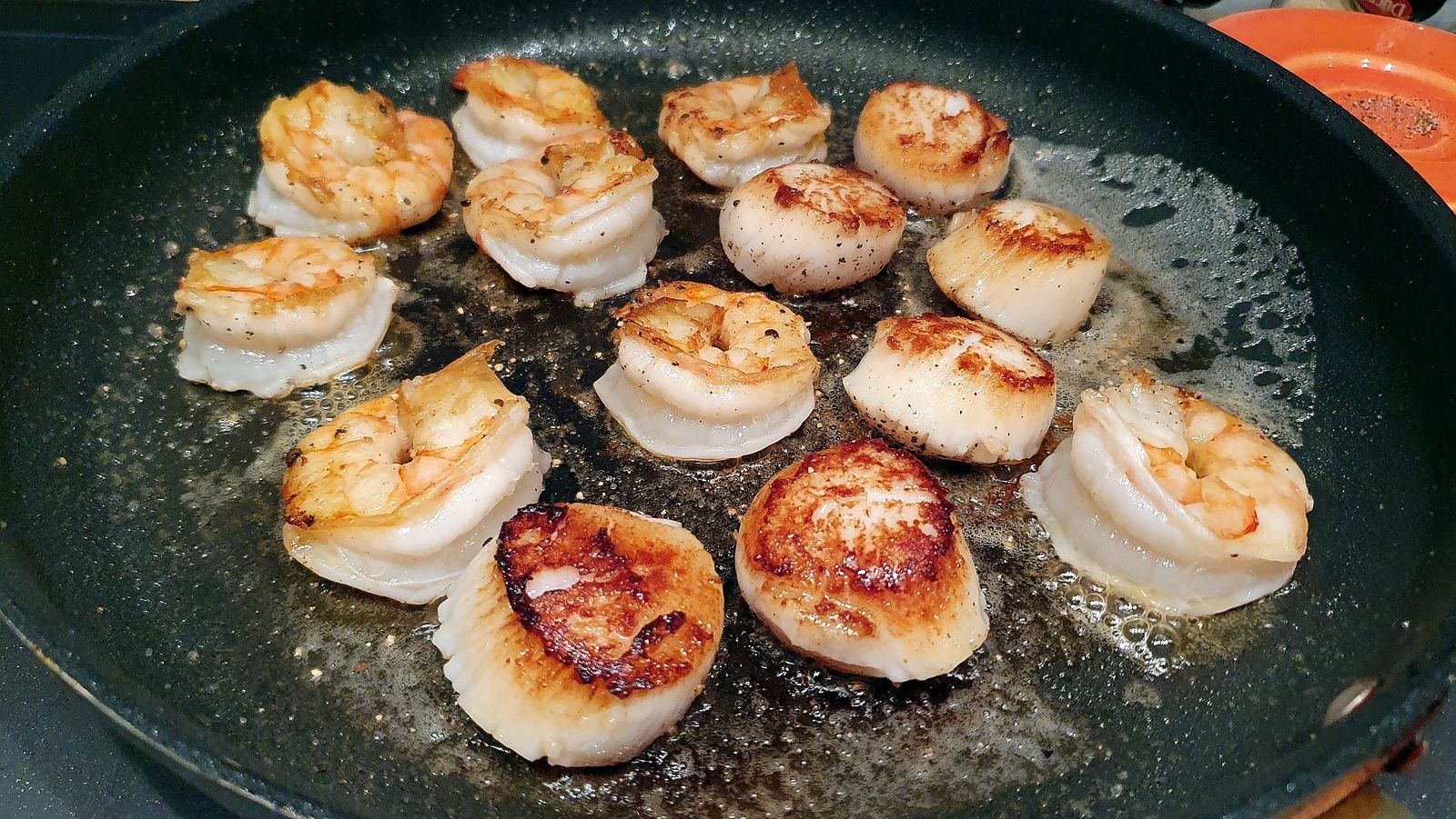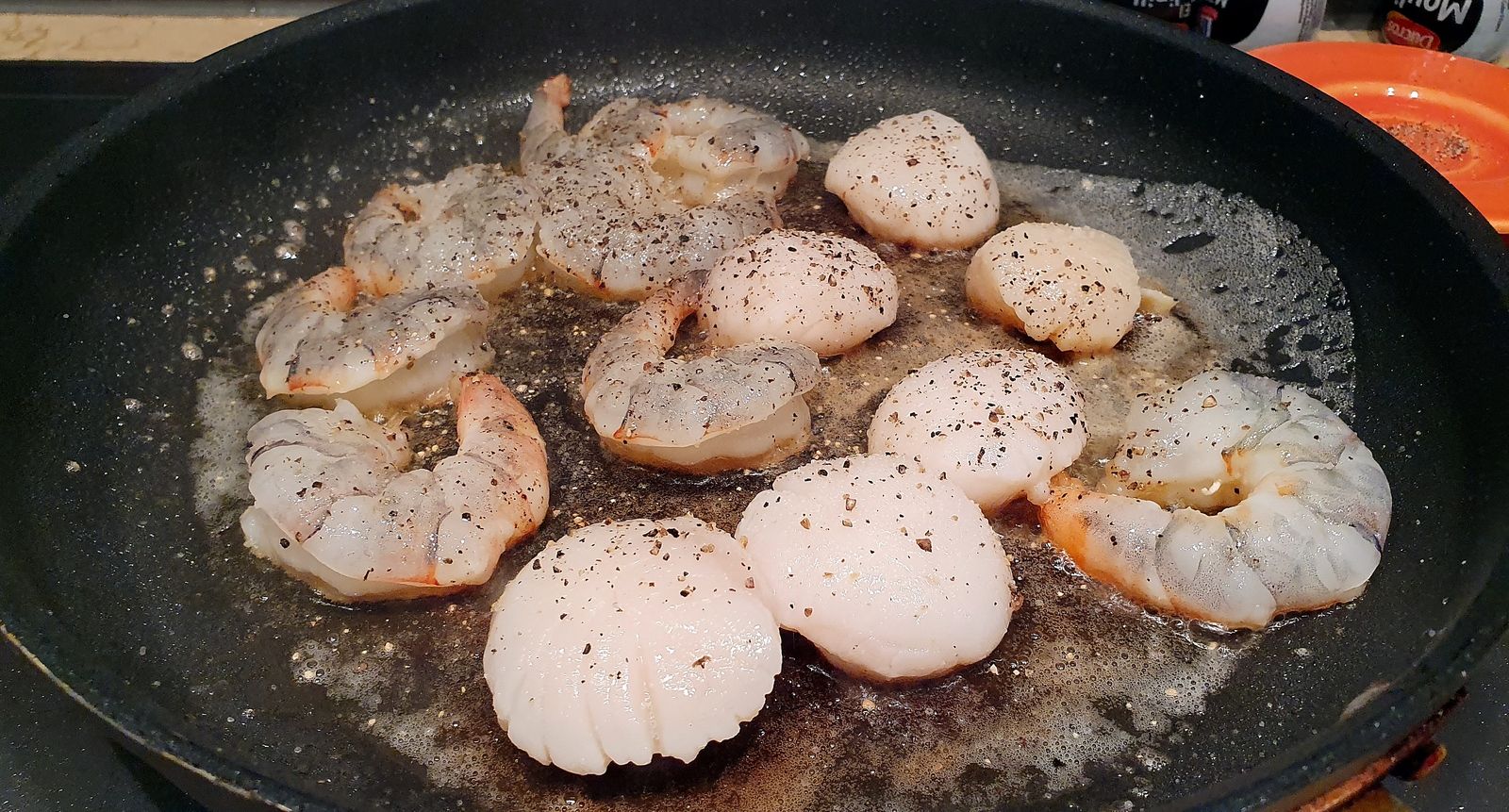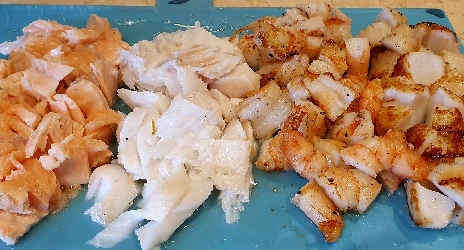 5) Dans une poêle, mettre à chauffer un filet d'huile à rôtir et saisir les crevettes et les noix de St-Jacques sur feu vif 2 minutes sur une face puis une minute sur l'autre. Saler et poivrer. Sortir du feu et couper les crevettes et les noix de St-Jacques en morceaux. Mettre avec le cabillaud et le saumon.