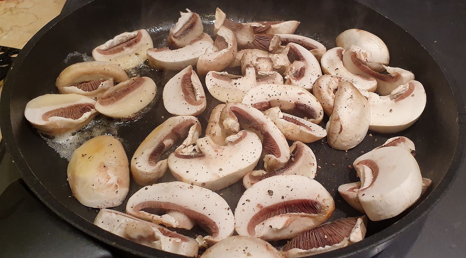 2) Pendant ce temps, vérifier que le cabillaud et le saumon n'aient plus d'arêtes. Essuyer les champignons avec du papier ménage et les couper en lamelles épaisses. Les faire revenir sur feu vif avec un peu d'huile à rôtir dans une poêle quelques minutes et les réserver.