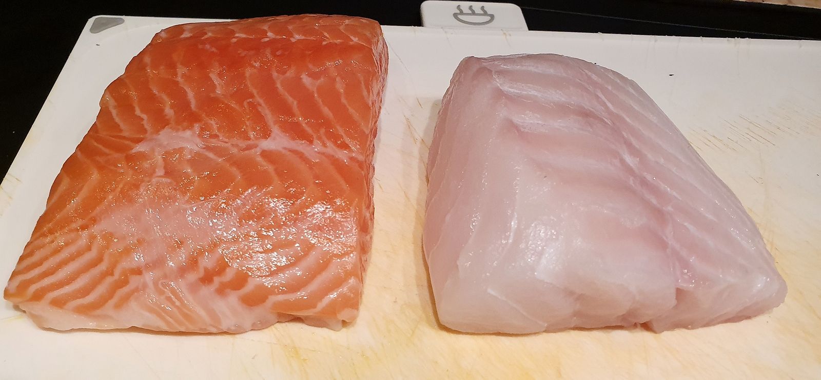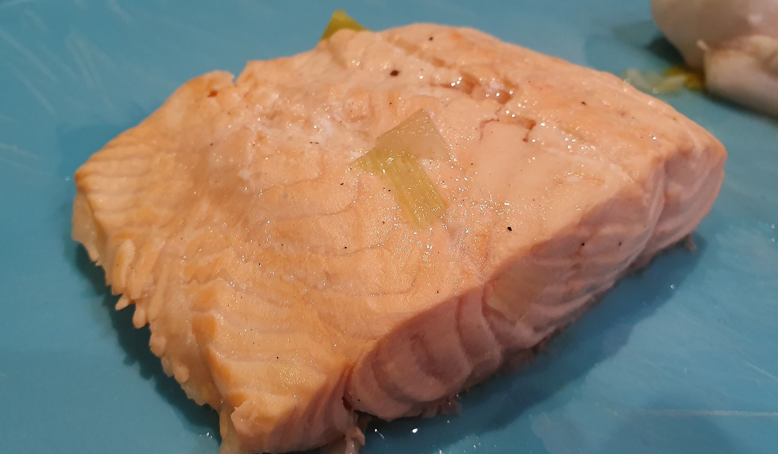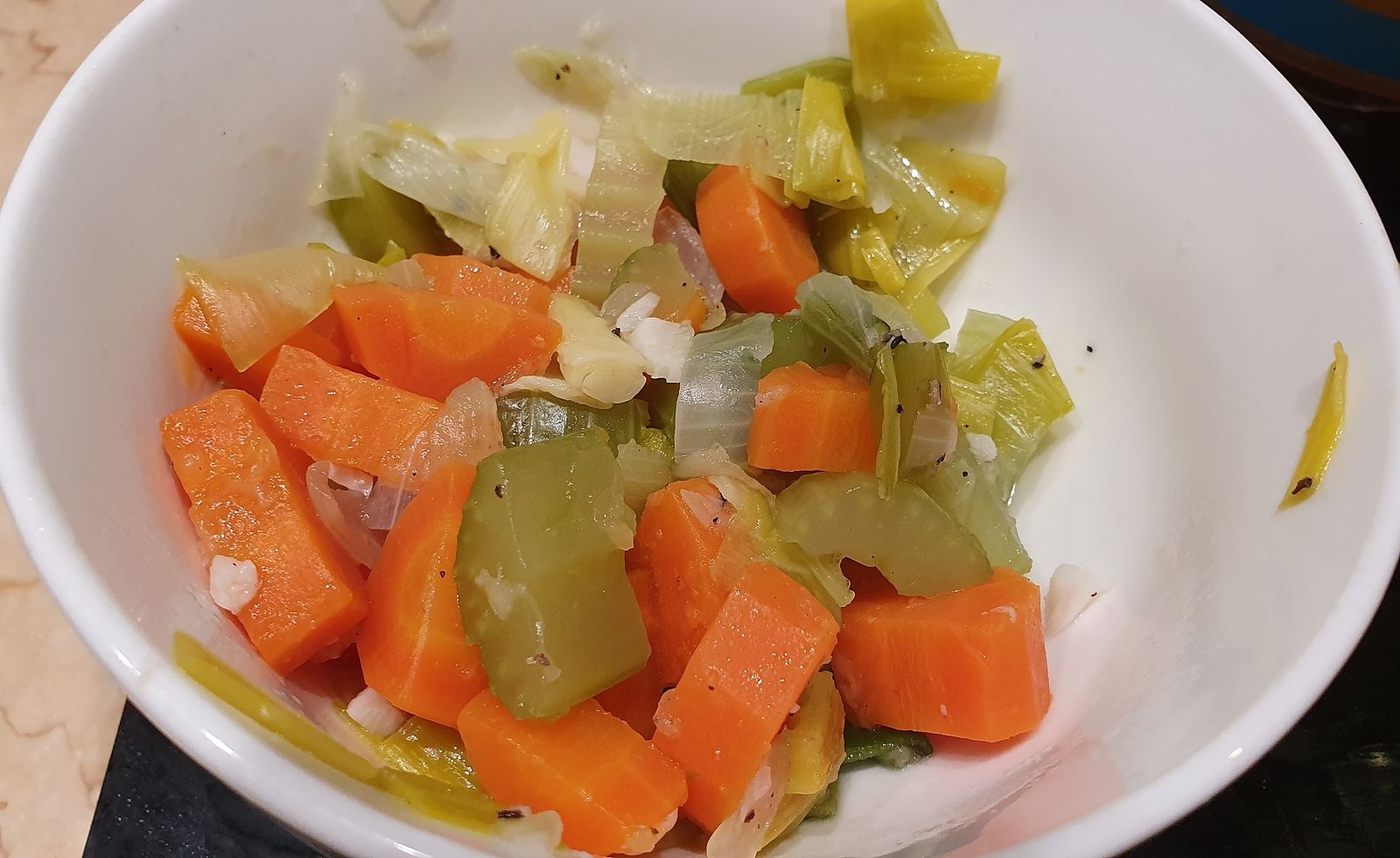 3) Lorsque le bouillon a mijoté 20 minutes (voir point 1), plonger le cabillaud et le saumon dans le bouillon frémissant. Pocher pendant 5 minutes puis sortir les poissons. Les laisser tiédir et les couper en cubes. Réserver dans un bol l'équivalent de 4 cuillères à soupe de légumes du bouillon car nous les ajouterons à la béchamel (ne pas utiliser le reste des légumes pour cette recette). Filtrer le bouillon à travers un chinois et le mettre dans un récipient.