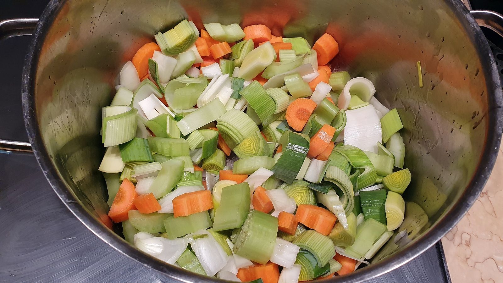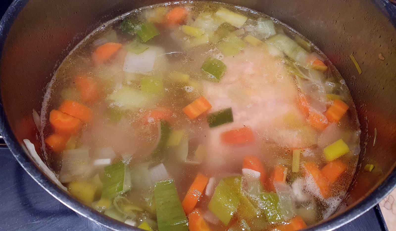 1) Préparer tout d'abord le bouillon: peler et couper les carottes en deux puis en demi-rondelles. Passer la branche de céleri sous l'eau froide puis la couper en petits morceaux. Faire de même avec le blanc de poireau. Peler et hacher grossièrement oignon et ail. Mettre ces ingrédients dans un récipient. Dans une casserole, mettre à chauffer un peu d'huile à rôtir et faire revenir les légumes en mélangeant durant 3 minutes. Ajouter ensuite 1,5 litre d'eau, le fumet de poisson, 2 cuillères à café de sel et poivrer. Porter à ébullition puis baisser le feu et laisser mijoter une vingtaine de minutes.