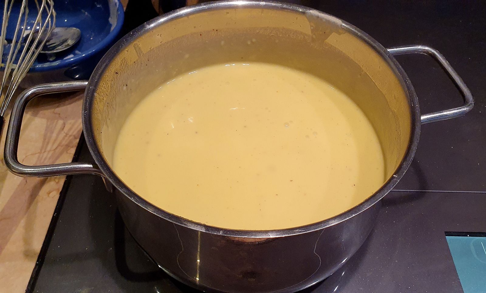 4) Préparer la sauce béchamel: faire fondre le beurre dans une casserole. Ajouter la farine et mélanger au fouet jusqu'à ce que le mélange soit homogène. Ajouter le lait tout en fouettant puis 6 dl du bouillon réservé. Fouetter pour éviter les grumeaux. Saler, poivrer et ajouter le safran. Porter à ébullition tout en fouettant puis baisser le feu et laisser cuire sur feu doux quelques minutes jusqu'à ce que la béchamel épaississe. Ajouter le jus de citron, goûter et rectifier l'assaisonnement. Maintenir sur feu très doux ou éteindre le feu et réchauffer plus tard. Si la béchamel est trop épaisse à votre goût, ajouter encore un peu de bouillon.