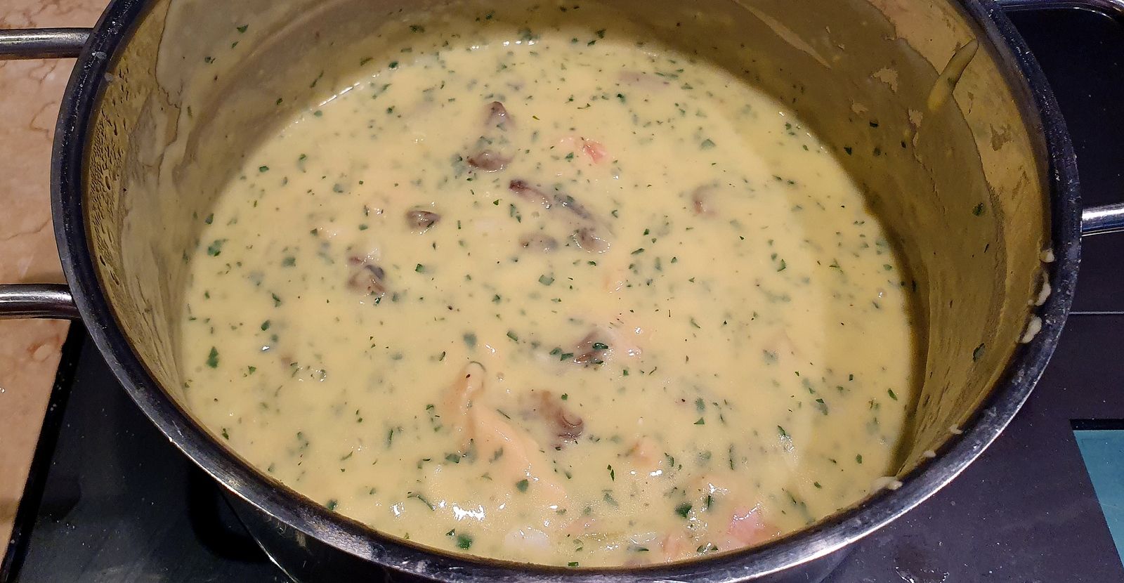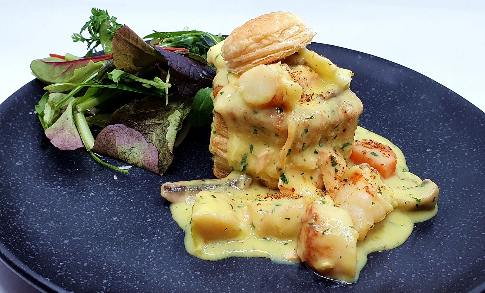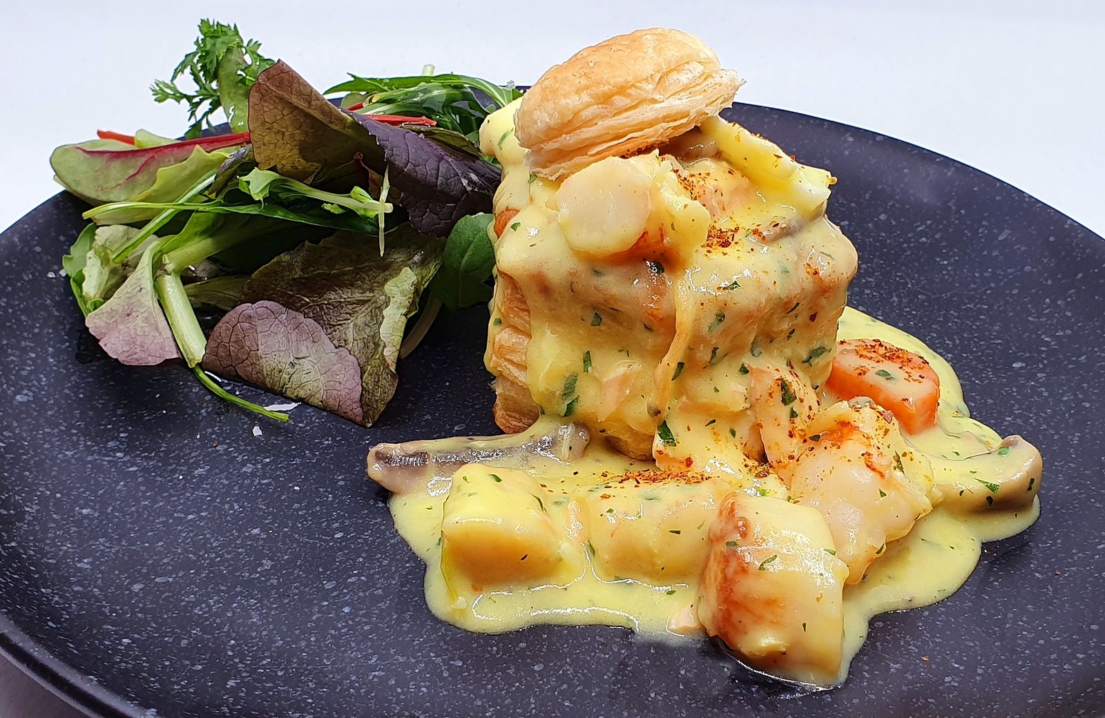 Autre façon de faire: réchauffer la béchamel avec le persil, les moules et les champignons. Verser la béchamel bien chaude sur les poissons, crevettes et noix de St-Jacques dans un récipient, mélanger et servir de suite dans les feuilletés.