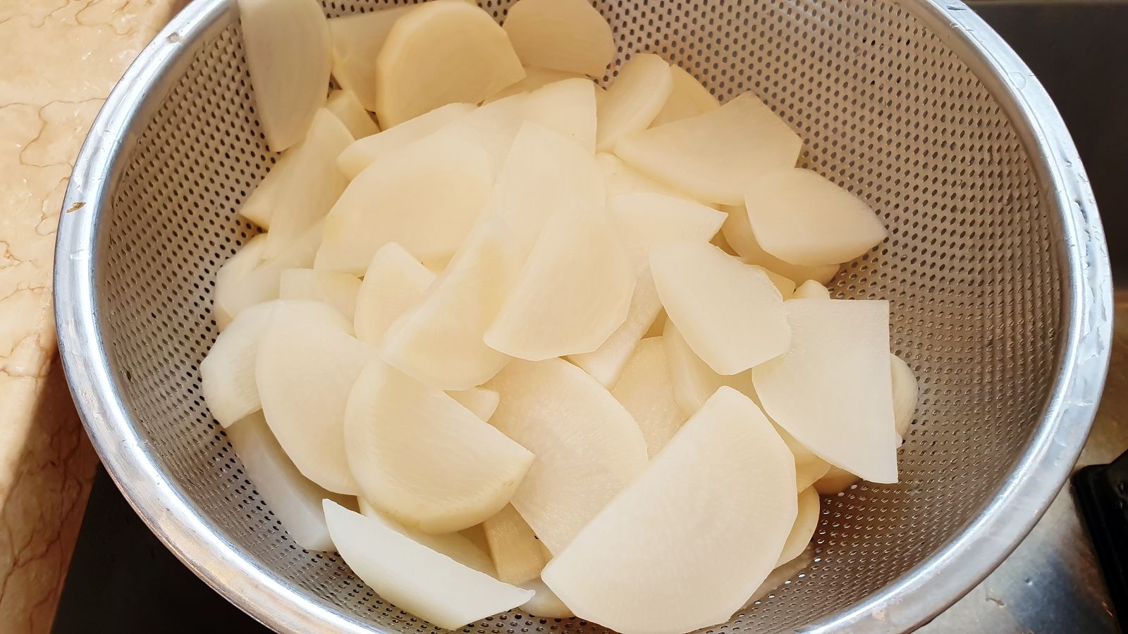 1) Peler les raves et couper l'extrémité de la racine. Couper les raves en deux puis en demi-rondelles. Porter de l'eau à ébullition dans une casserole avec une cuillère à café de sel. Lorsque l'eau bout, y mettre les raves et baisser sur feu moyen. Laisser cuire une dizaine de minutes, le temps que les raves soient cuites (goûter). Egoutter et réserver.