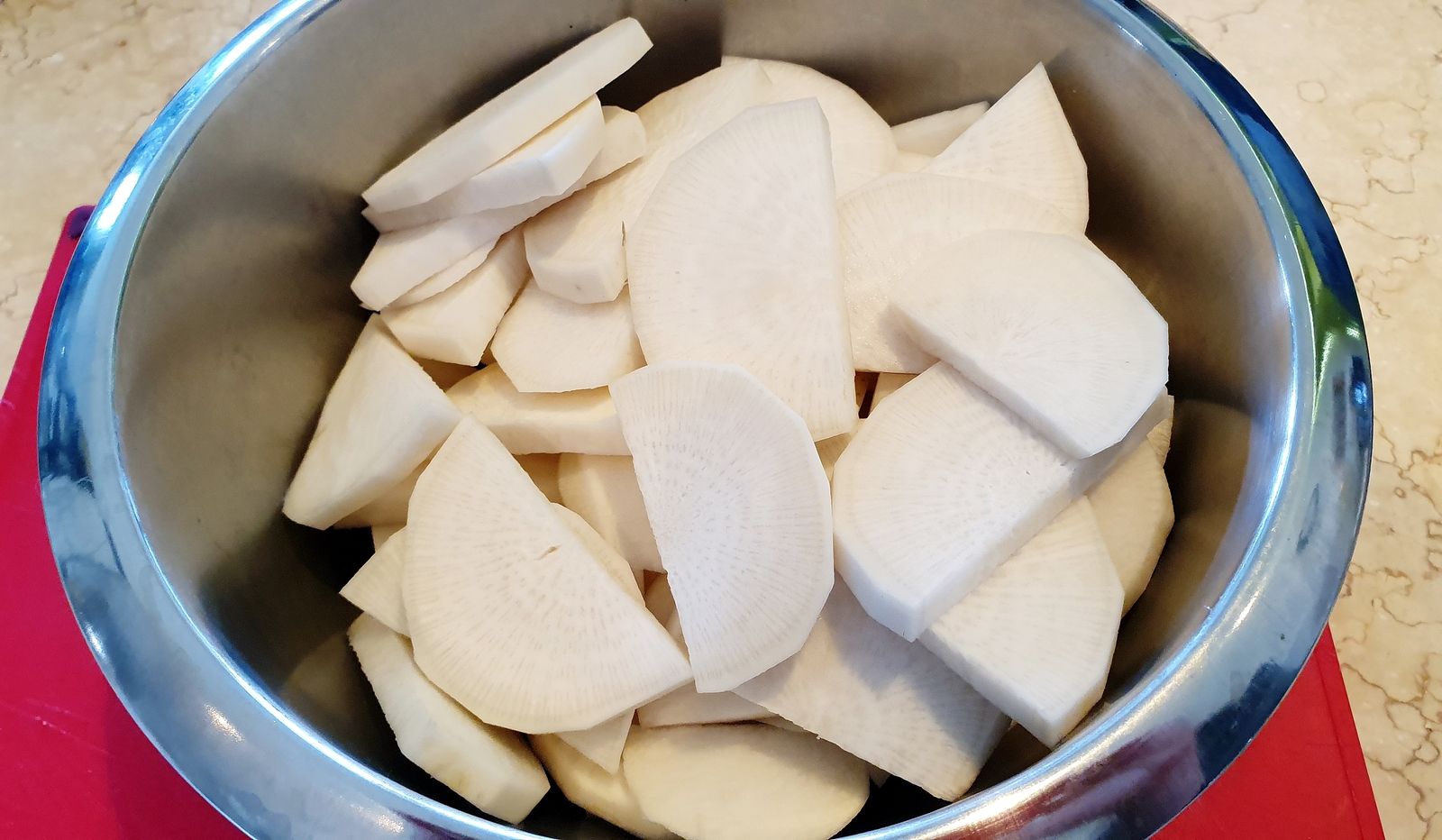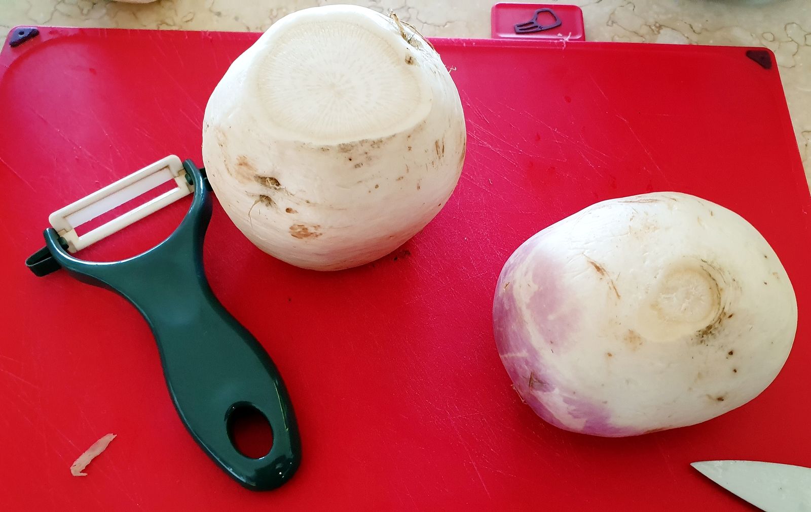C'est la rave d'automne qui est aussi appelée navet blanc. A l'extérieur, sa peau est blanche à mauve et sa chair est toute blanche. Vous voyez de quoi je parle? Bon alors on peut commencer..