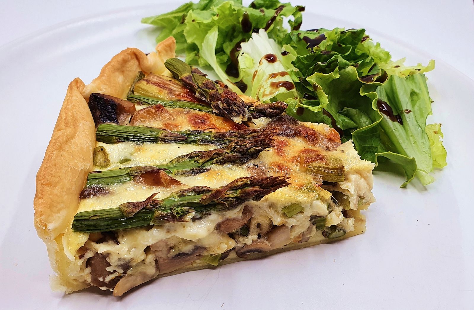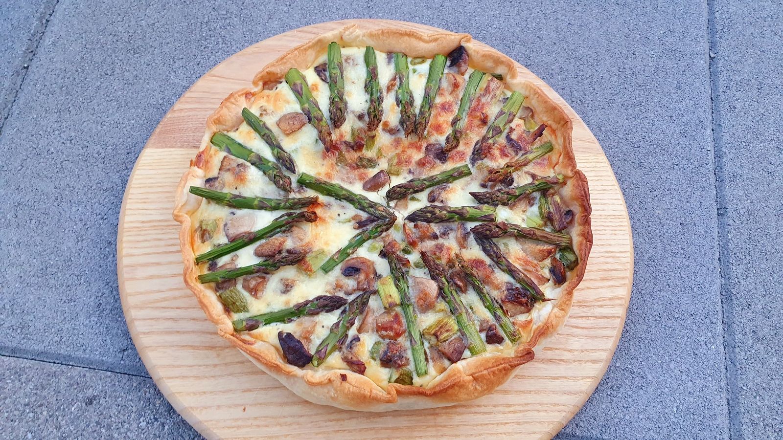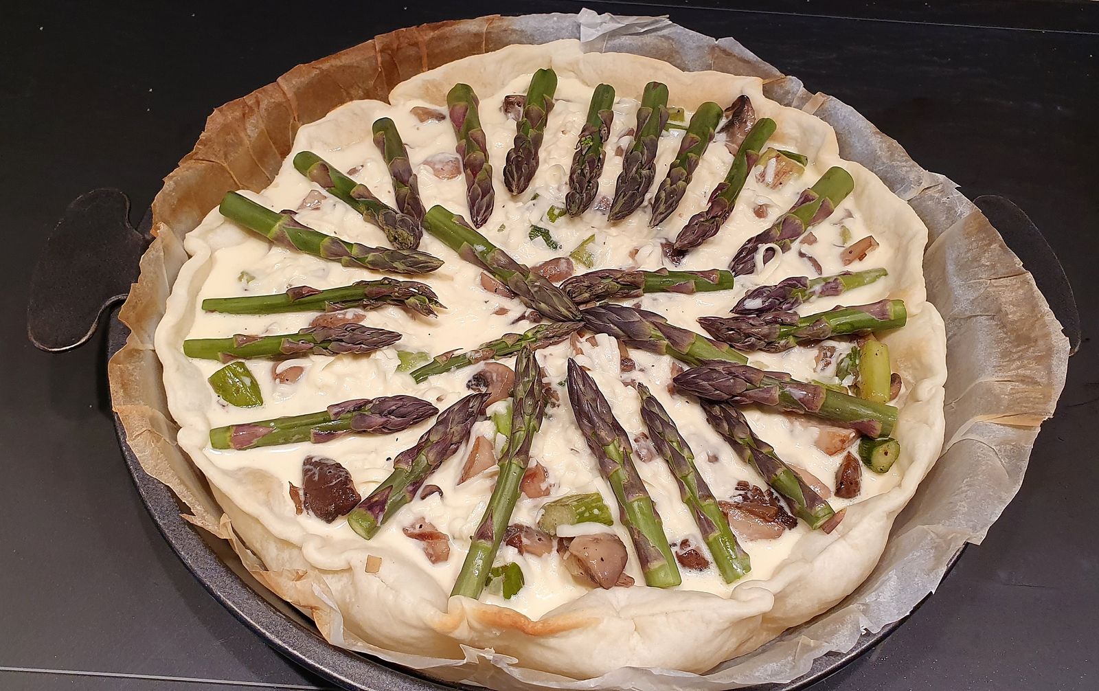 5) Mélanger les champignons et les morceaux d'asperges et déposer le tout sur la pâte. Recouvrir avec la liaison. Déposer joliment les têtes d'asperges sur le dessus. Enfourner immédiatement dans le four préchauffé à 200°C pour environ 35 minutes. La quiche doit être bien dorée. Sortir du four, laisser reposer deux minutes et servir avec une salade.