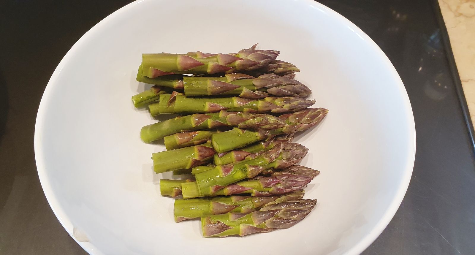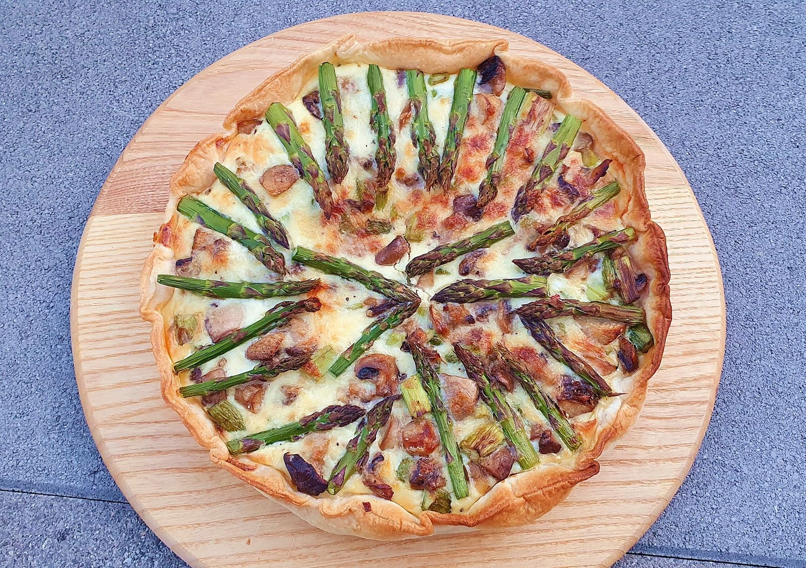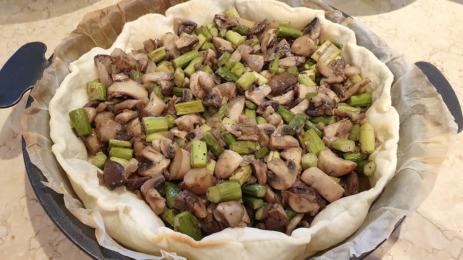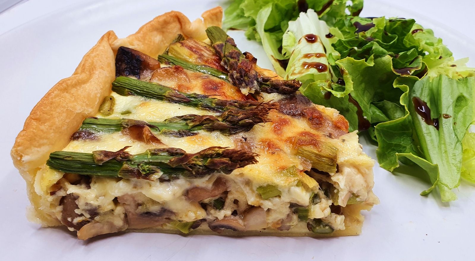 5) Mélanger les champignons et les morceaux d'asperges et déposer le tout sur la pâte. Recouvrir avec la liaison. Déposer joliment les têtes d'asperges sur le dessus. Enfourner immédiatement dans le four préchauffé à 200°C pour environ 35 minutes. La quiche doit être bien dorée. Sortir du four, laisser reposer deux minutes et servir avec une salade.