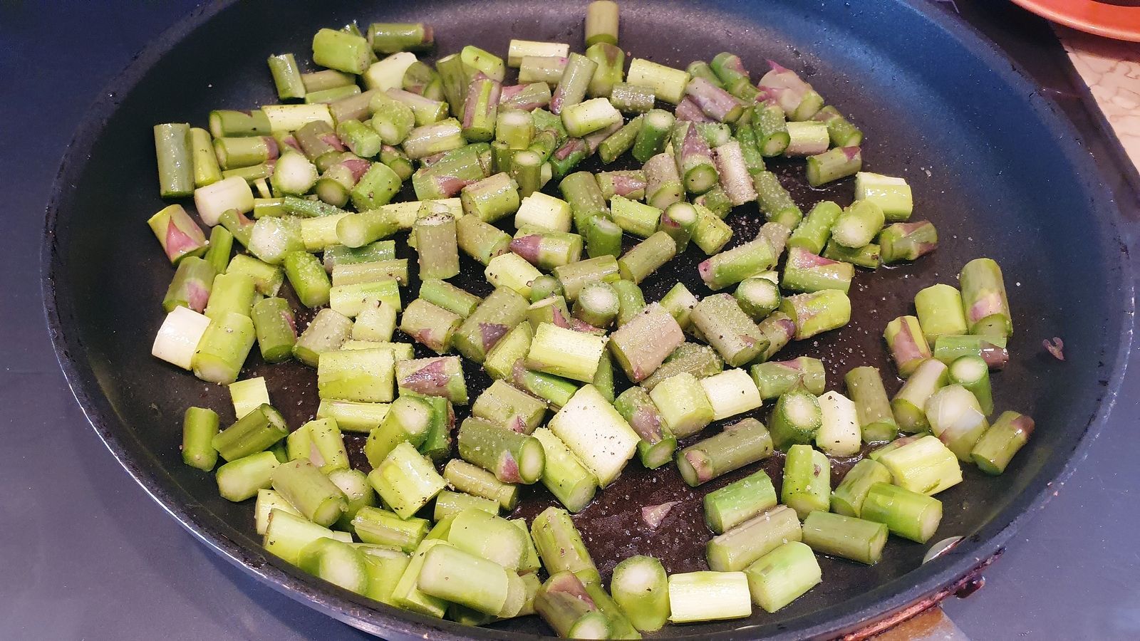 1) Passer les asperges sous l'eau froide. Retirer l'extrémité du bas des asperges sur 2 cm. Couper les têtes et réserver dans un bol. Eplucher sur 3 cm le bas des asperges puis couper en petits morceaux. Réserver. Dans une poêle, faire chauffer un peu d'huile d'olive et faire revenir les morceaux d'asperges sur feu moyen une dizaine de minutes. Couvrir en début de cuisson. Les morceaux doivent être cuits mais un peu al dente. Saler et poivrer. Si vous utilisez de grosses asperges, faire revenir aussi les têtes à part pendant 2 à 3 minutes. Si vous utilisez des asperges fines, inutile de précuire les têtes, elles cuiront au four sur la quiche. Réserver les morceaux dans un bol.