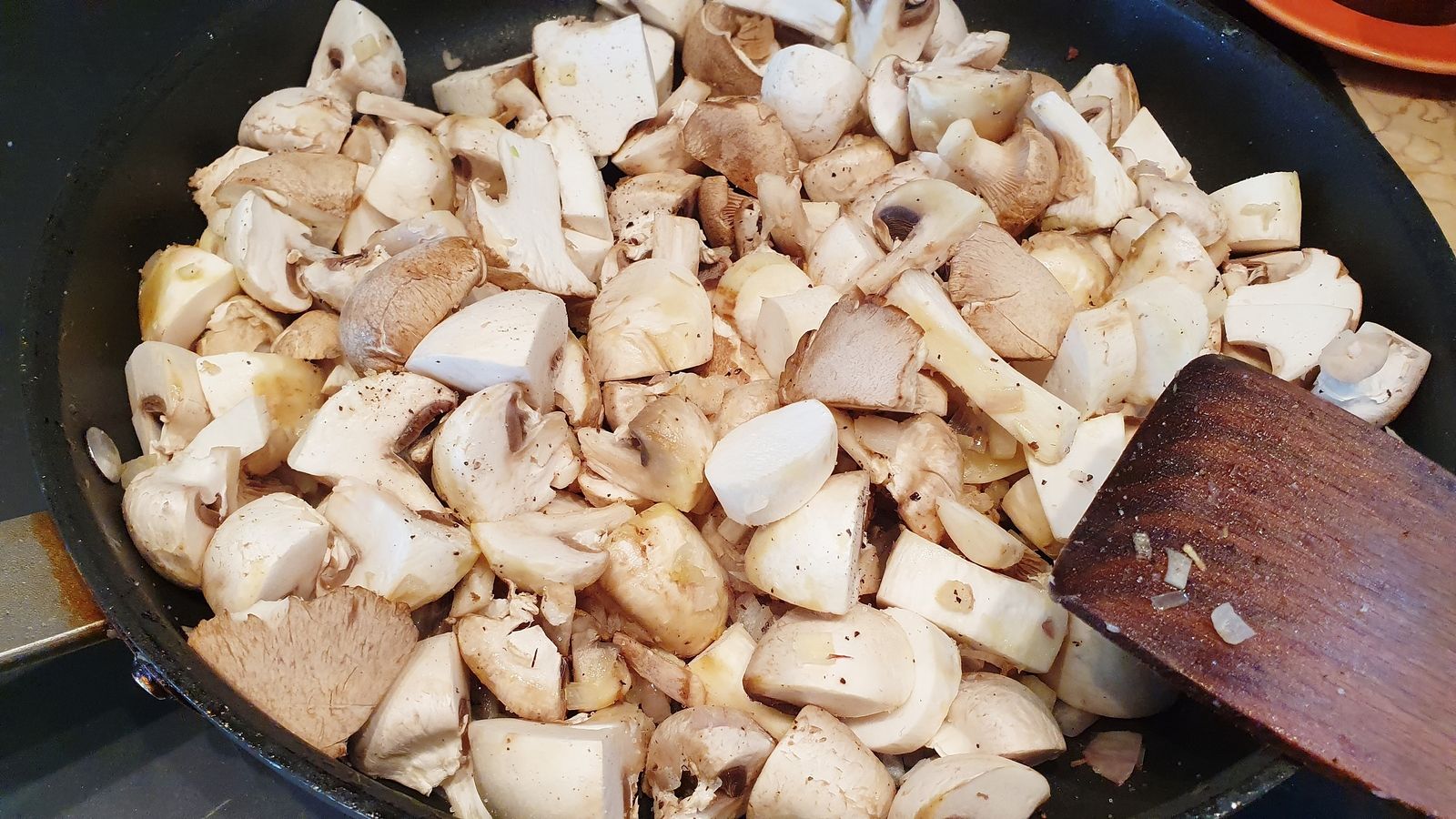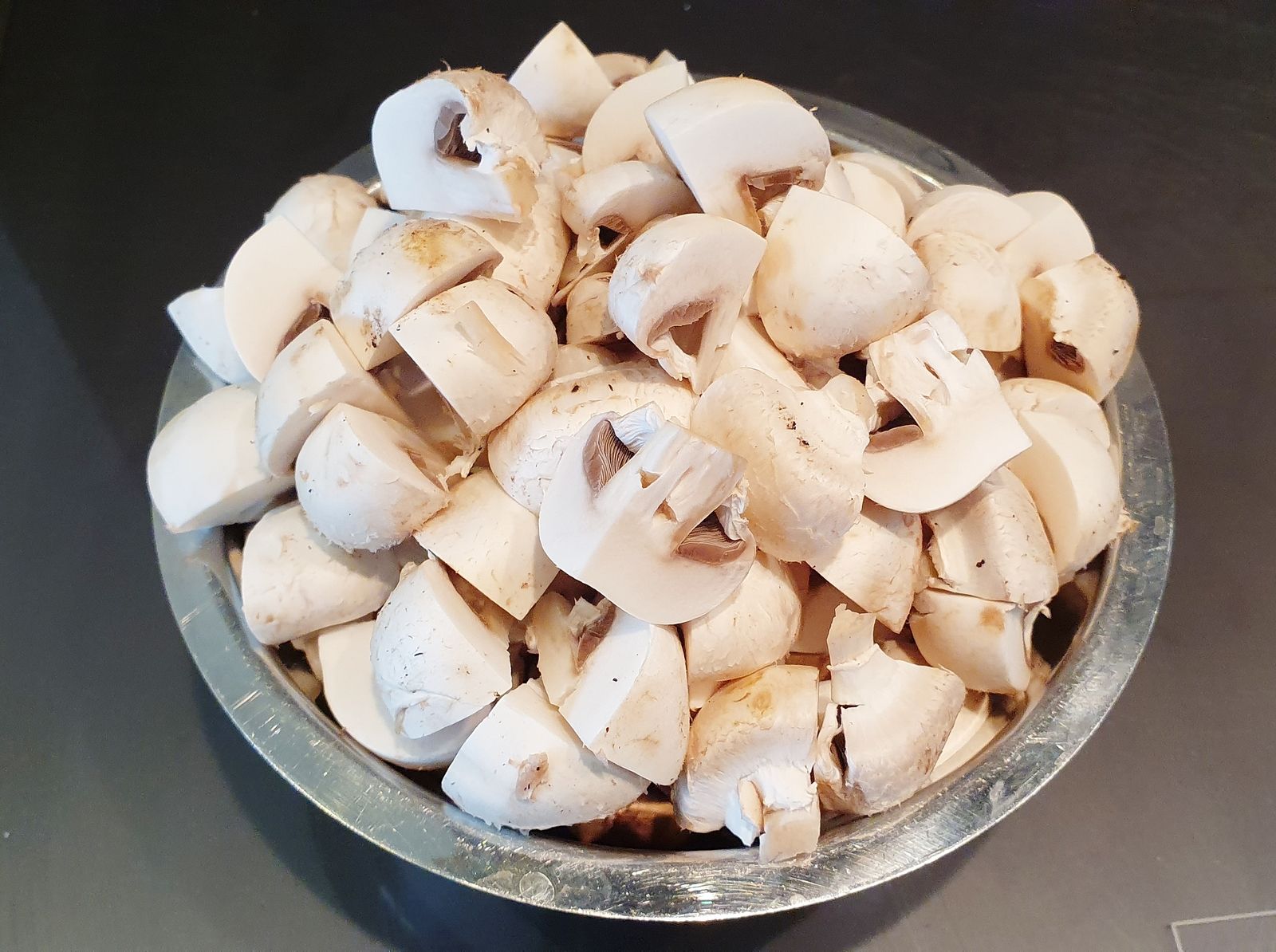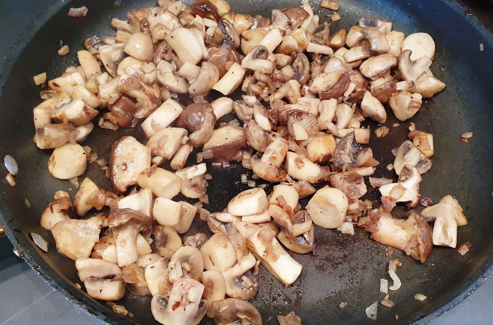 2) Essuyer les champignons avec du papier ménage pour enlever toute trace de terre. Couper l'extrémité des pieds. Couper les champignons en morceaux moyens. Peler et hacher finement ail et échalote. Dans une poêle, mettre à chauffer un filet d'huile d'olive et faire revenir ail et échalote une minute sur feu moyen. Ajouter les champignons et les faire revenir une dizaine de minutes jusqu'à ce qu'ils aient rendu toute leur eau, c'est important. Saler et poivrer. Lorsqu'ils commencent à attacher le fond, c'est bon! Les réserver dans une passoire au-dessus d'un récipient pour les égoutter encore au maximum.