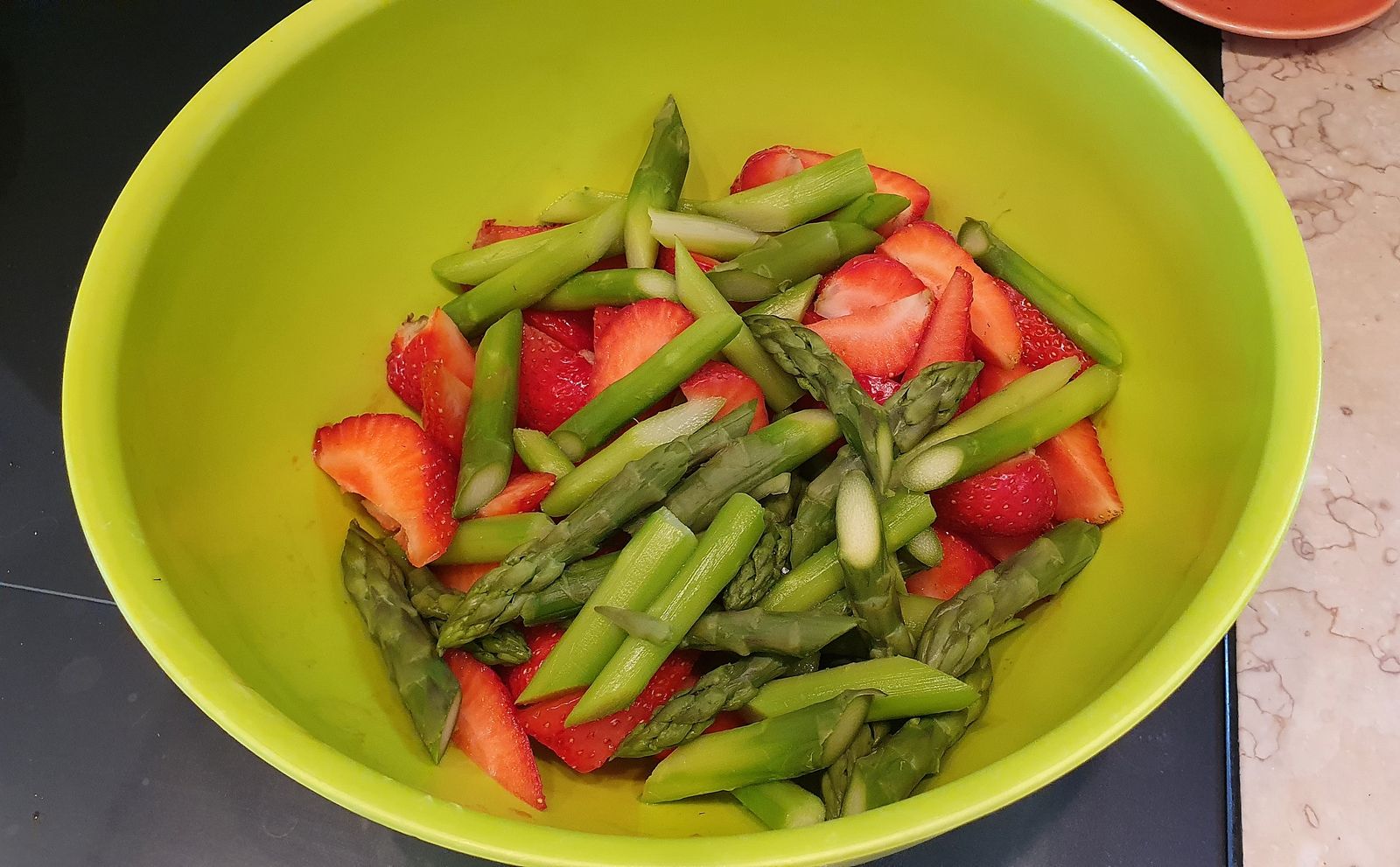 3) Passer les asperges sous l'eau froide. Eplucher les pieds sur 3 à 4 cm. Découper les asperges en tronçons en laissant les têtes entières. Les plonger dans une casserole d'eau frémissante et salée pendant 5 minutes environ. Goûter, elles doivent être cuites al dente. Les égoutter et réserver. Les laisser refroidir puis les mélanger aux fraises.