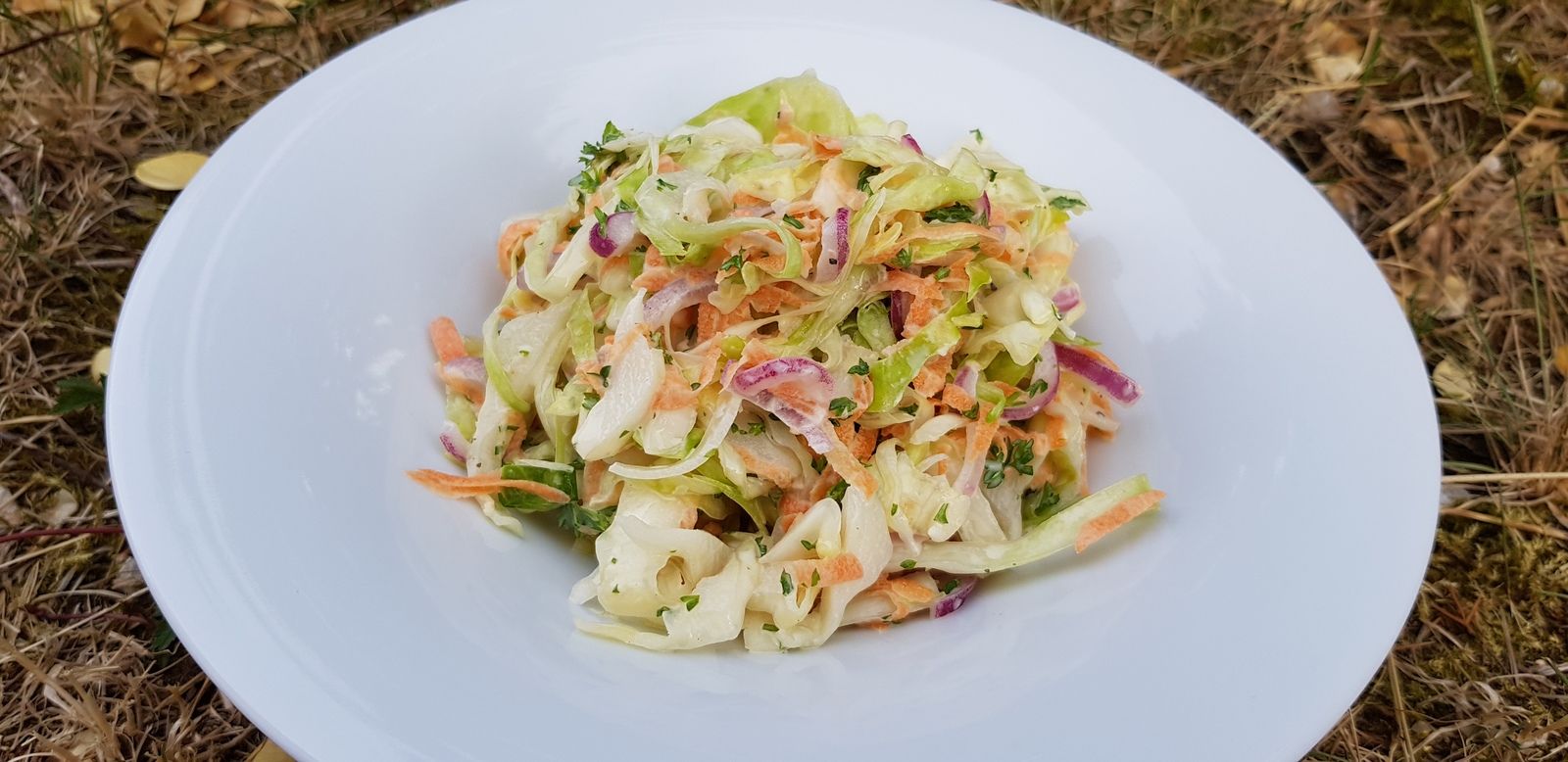 C'est en Amérique du Nord que nous allons chercher cette salade de chou délicieuse, réalisée avec des carottes, des oignons rouges, du persil et une super mayonnaise. Le chou est "cuit" grâce au sel et au sucre puis rincé soigneusement. Et oui, c'est ainsi qu'elle sera parfaite, votre salade Coleslaw.