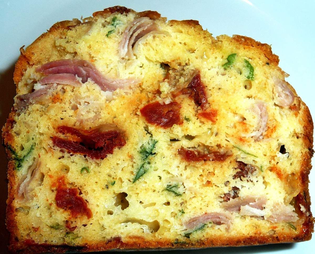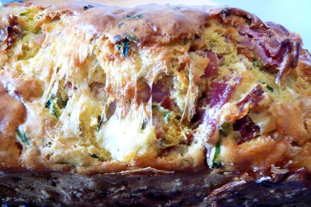 6) Mettre le mélange dans un moule à cake beurré et fariné. Lisser le dessus. Enfourner pour environ 35 minutes à 200°C. Vérifier la cuisson en plantant la lame d'un couteau, elle doit ressortir sèche. Laisser tiédir, décoller les bords avec un couteau et démouler.