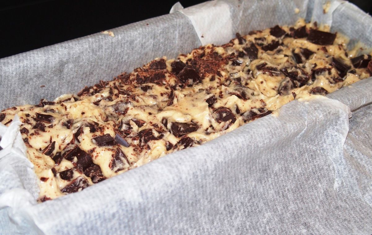 4) Concasser avec un couteau le chocolat en tout petits dés. Dans le moule beurré et fariné (ou recouvert d'une feuille de papier sulfurisé), verser la moitié de la préparation. Parsemer de la moitié des dés de chocolat. Verser la deuxième moitié de la préparation et ajouter la deuxième moitié des dés de chocolat. Les enfoncer légèrement dans l'appareil avec une spatule. Lisser un peu.