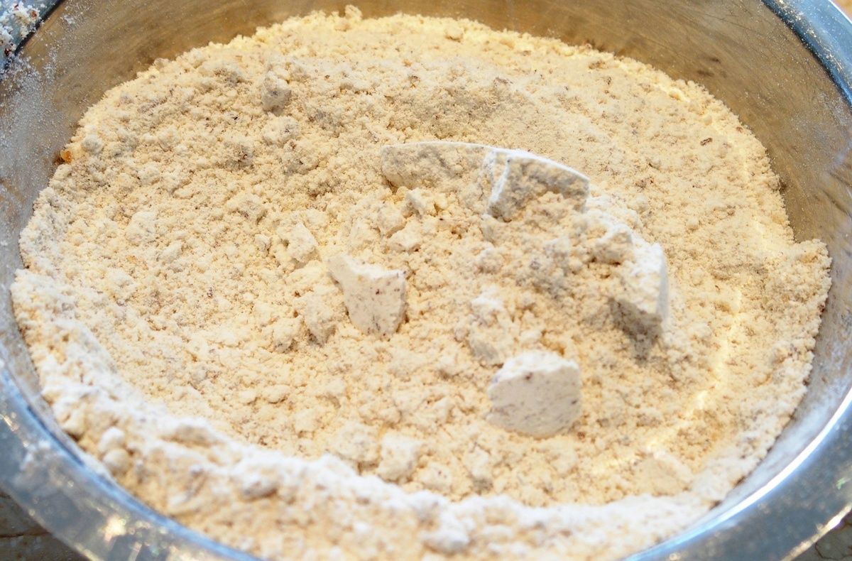 3) Dans un autre récipient, mélanger la farine, le sel, le sucre vanillé, les noisettes moulues et la poudre à lever. Prendre un batteur électrique (ou un fouet si vous n'avez pas de batteur). Dans le récipient contenant le sucre et le beurre, ajouter les oeufs un à un en battant à faible puissance. Lorsque le mélange est homogène, ajouter l'autre mélange (farine, poudre à lever...) en plusieurs fois et en alternance avec le lait afin d'éviter les grumeaux, toujours en battant jusqu'à obtenir une pâte lisse.