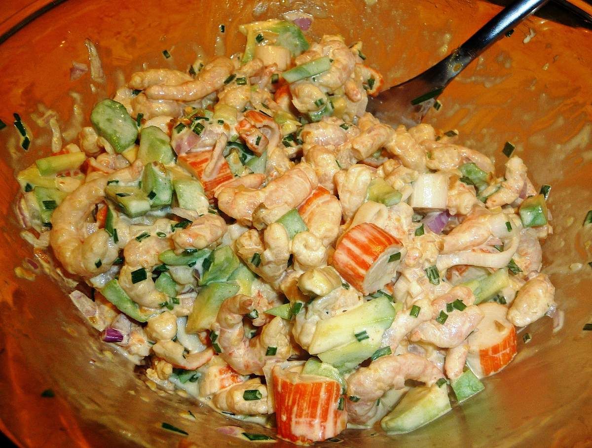 1) Couper le surimi en petits morceaux. Egoutter les crevettes. Couper l'avocat en petits morceaux. Mettre tous ces ingrédients dans un plat. Arroser de jus de citron et mélanger.