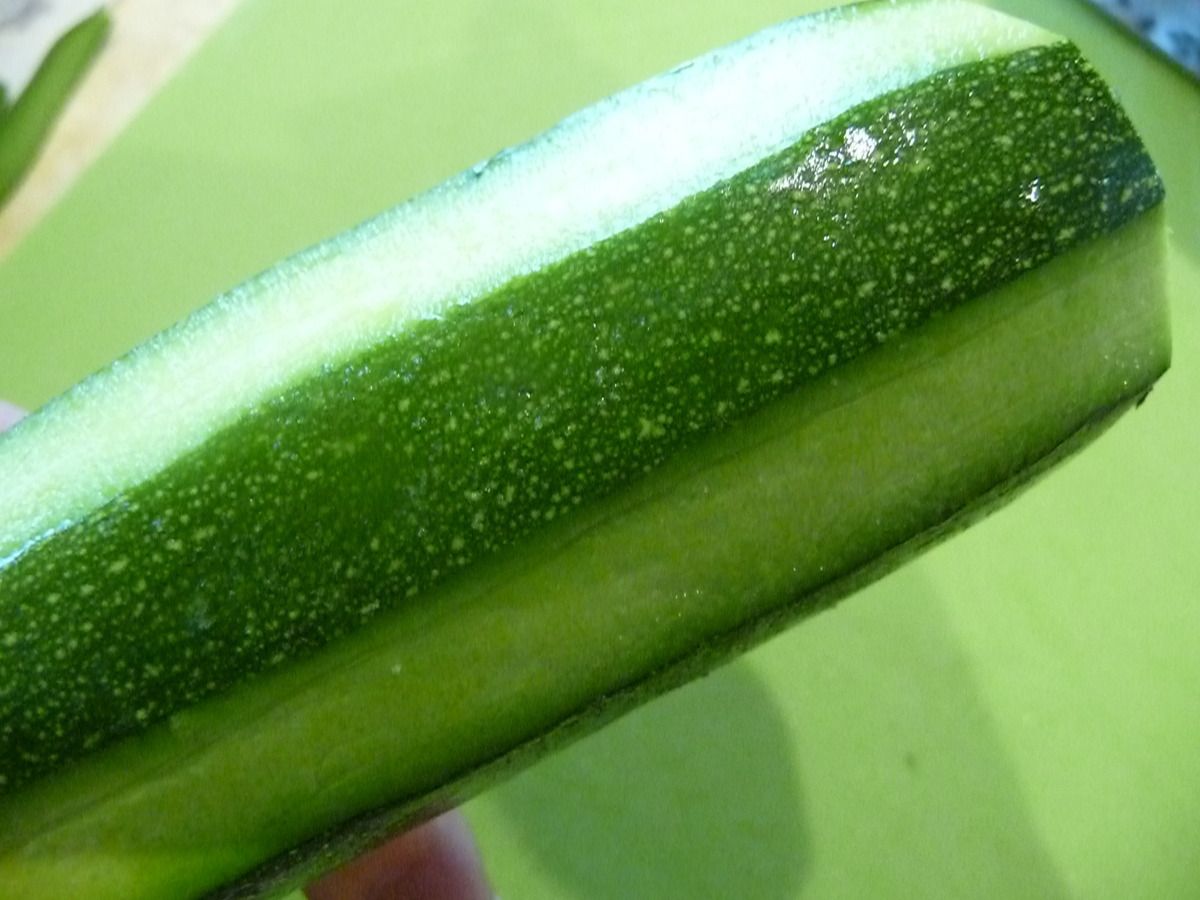1) Couper les extrémités des courgettes. Ne pas les éplucher, ou les éplucher en bandes une fois sur deux. Comme ça: