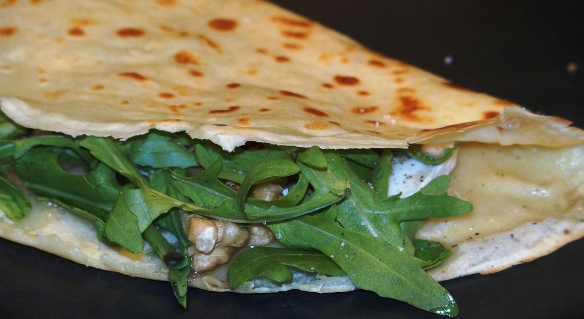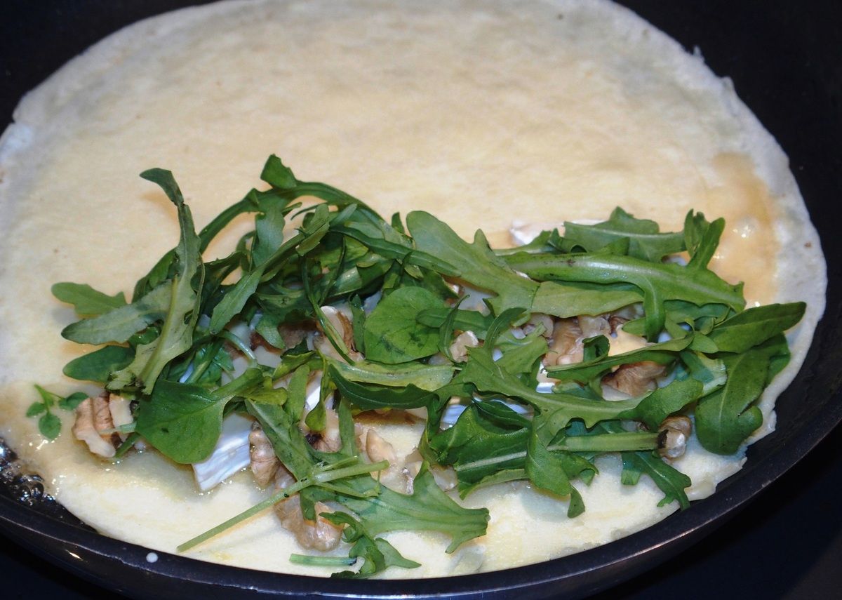 1) Lorsque la crêpe est retournée dans la poêle, ajouter quelques rondelles de fromage sur la moitié de la crêpe, quelques cerneaux de noix, un peu de roquette et un petit filet de miel. Laisser fondre le fromage une minute, refermer la crêpe et servir...