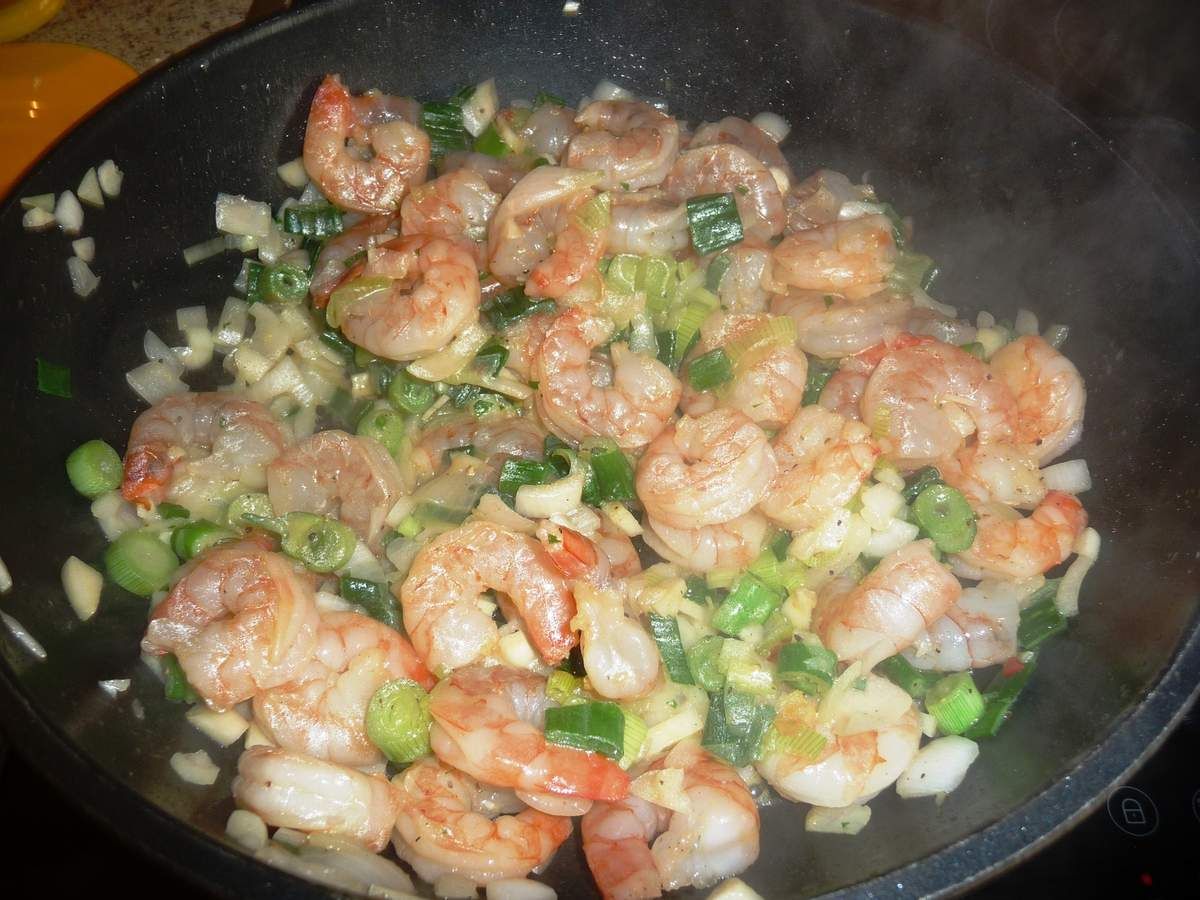 9) Ajouter les crevettes et faire revenir jusqu'à ce qu'elles soient roses ( minutes environ).
