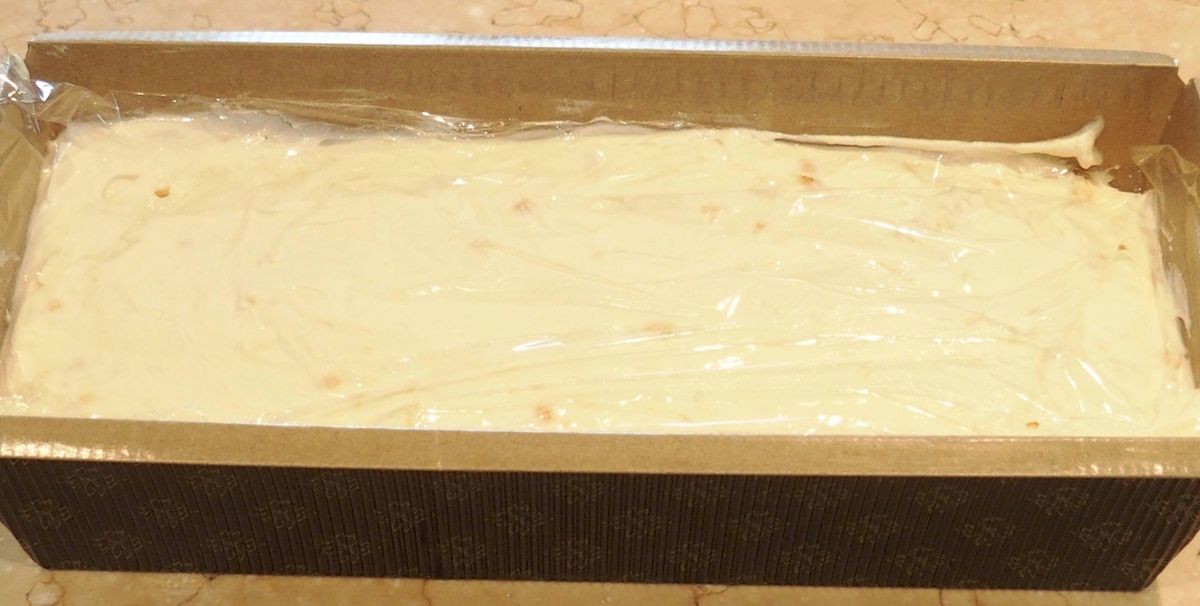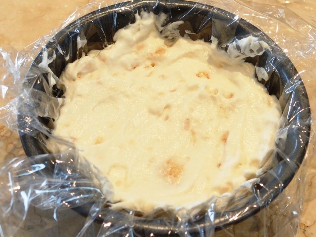 3) Verser le mélange dans un moule chemisé de papier film(ou tout plat qui va au congélateur). Si vous utilisez un moule jetable, pas besoin de le chemiser de papier film. Chemiser également des moules individuels si vous en utilisez. Tasser en tapotant le moule contre le plan de travail et lisser avec une spatule. Recouvrir le dessus de la glace en rabattant délicatement le papier film, ce qui permettra à la glace de ne pas cristalliser sur le dessus. Placer au congélateur 24 heures