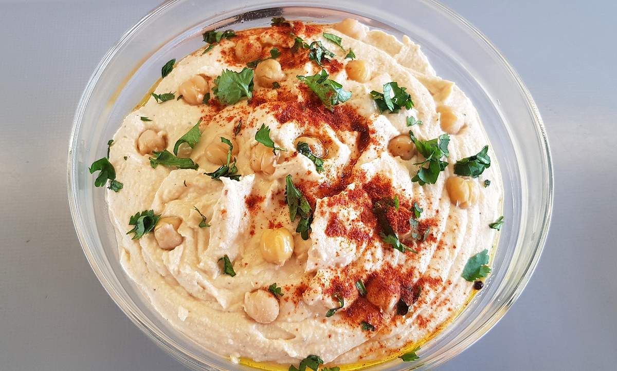 4) Mettre l'hommos dans un plat creux. Réfrigérer jusqu’au service. Arroser d'un bon filet d'huile d'olive. Décorer avec les pois chiches entiers. Parsemer le centre de coriandre. Saupoudrer avec du paprika pour donner de la couleur. Servir avec du pain libanais.