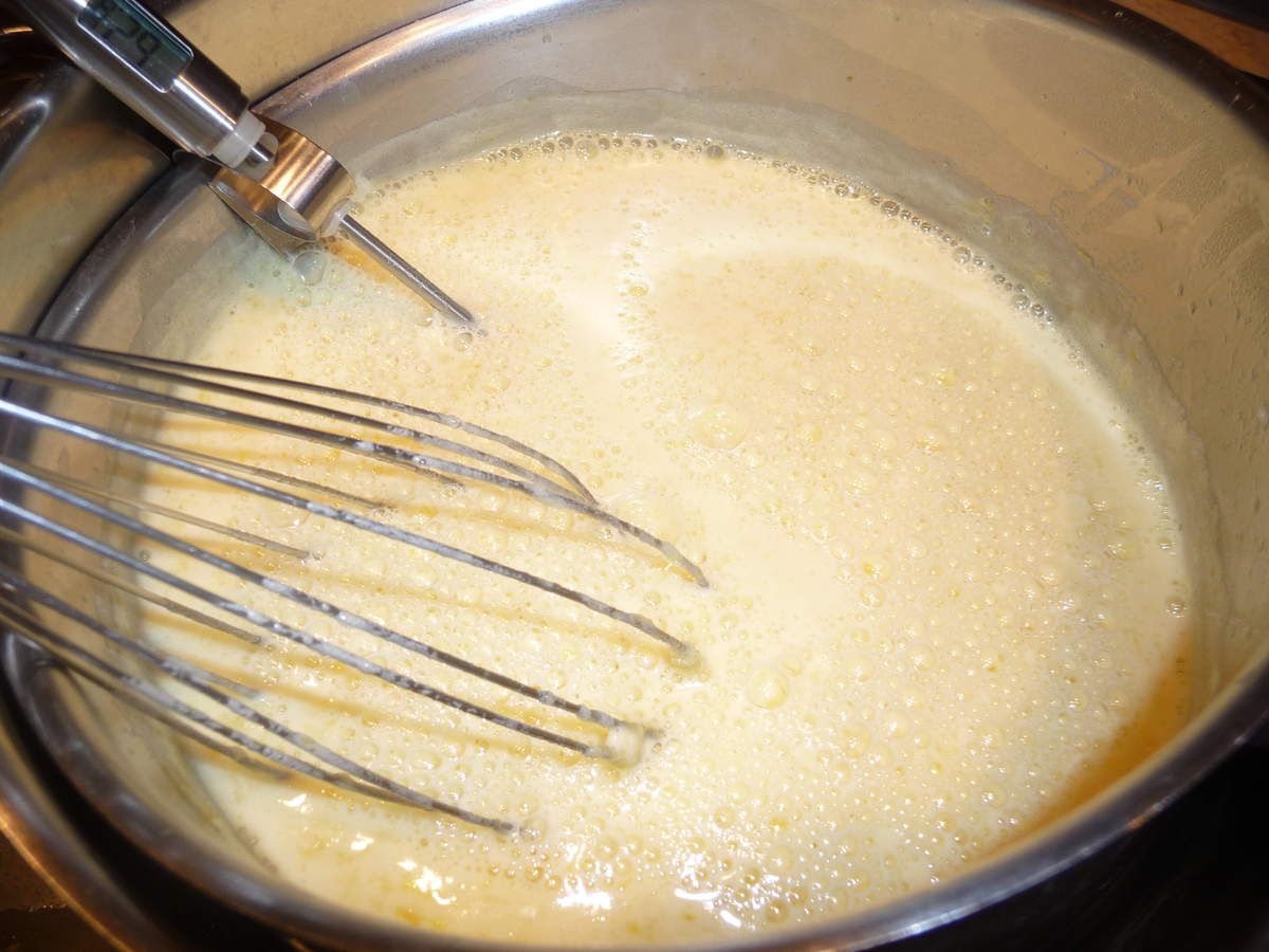 La crème va épaissir en 10 à 15 minutes. Il est important de mélanger souvent. Dès qu'elle est assez épaisse, vous pouvez retirer la casserole du feu et la mettre dans un récipient. A noter que la température idéale à atteindre est de 82°C, raison pour laquelle j'ai utilisé un thermomètre (ainsi les oeufs ne peuvent pas coaguler). Mais si vous n'en avez pas, retirez-la lorsque la consistance devient assez épaisse.