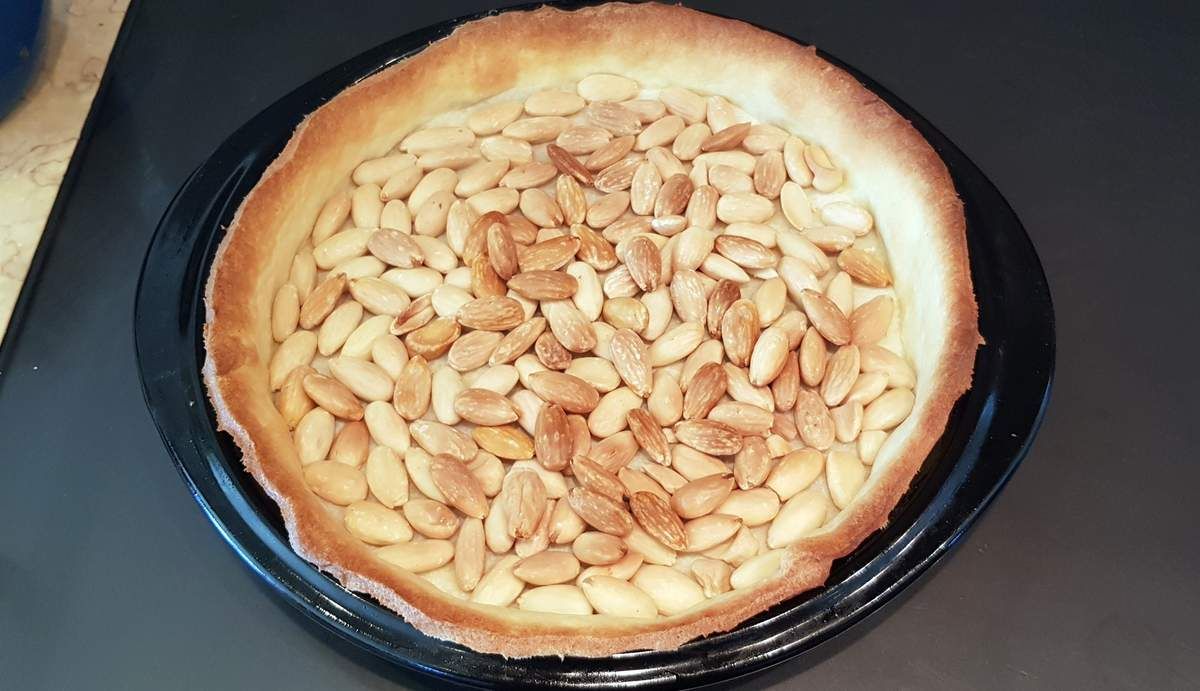 2) Préchauffer votre four à 200°C. Beurrer et fariner un moule à tarte. Abaisser la pâte dans le moule en la collant bien contre les bords. Piquer le fond avec une fourchette. Couper un rond de papier sulfurisé et le déposer sur le fond de la tarte. Le recouvrir avec des fruits secs par exemple (là j'ai utilisé des amandes entières). Cela évitera que la pâte ne lève lors de sa cuisson à blanc.