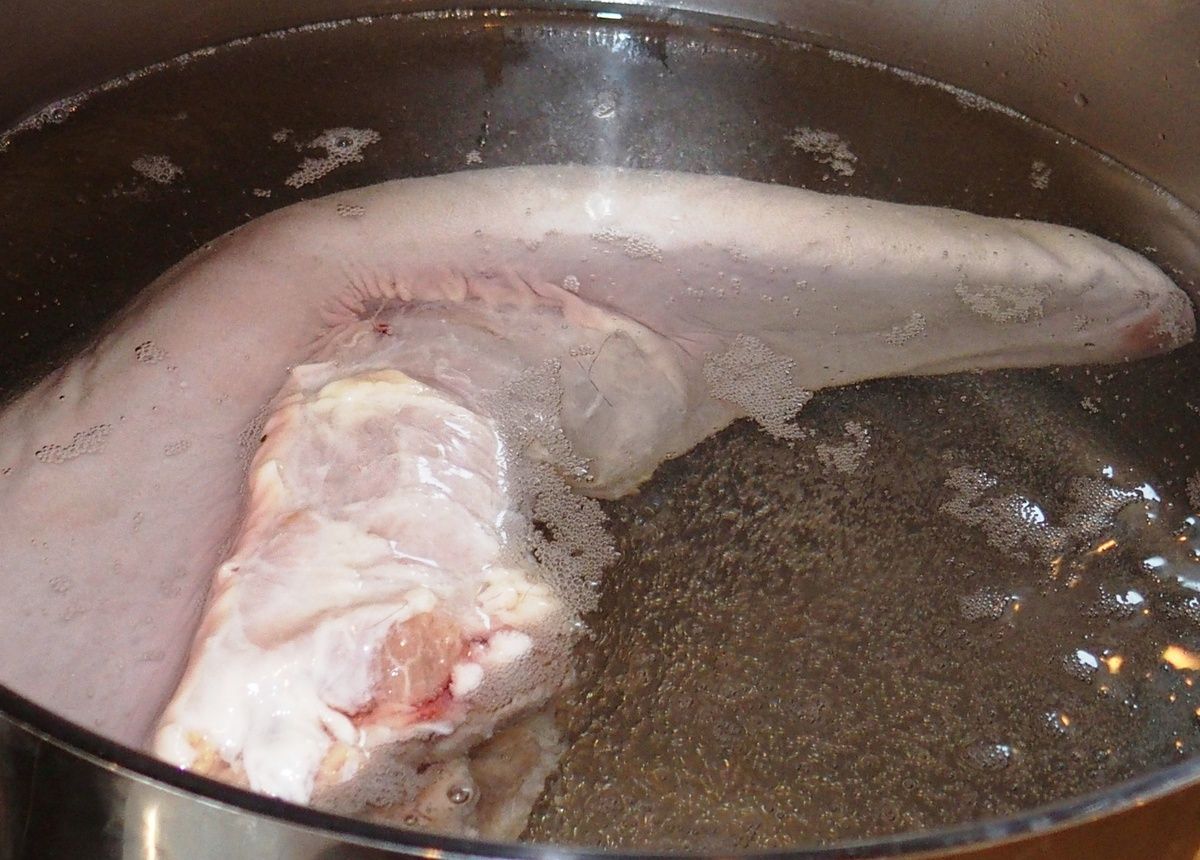 3) Rincer la langue sous l'eau froide. La plonger dans une marmite d'eau. Porter à ébullition. Compter environ 5 minutes jusqu'à ce que se forme l'écume.